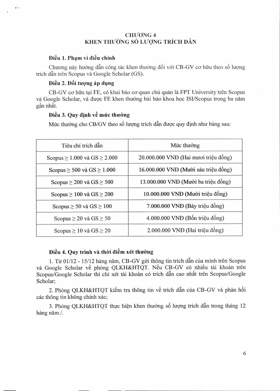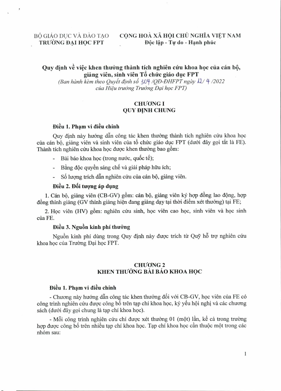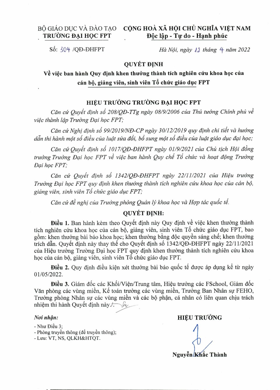 Quy định khen thưởng thành tích nghiên cứu khoa học của cán bộ, giảng viên, sinh viên Tổ chức Giáo dục FPT