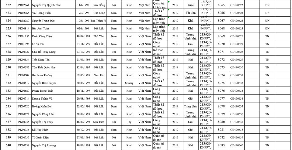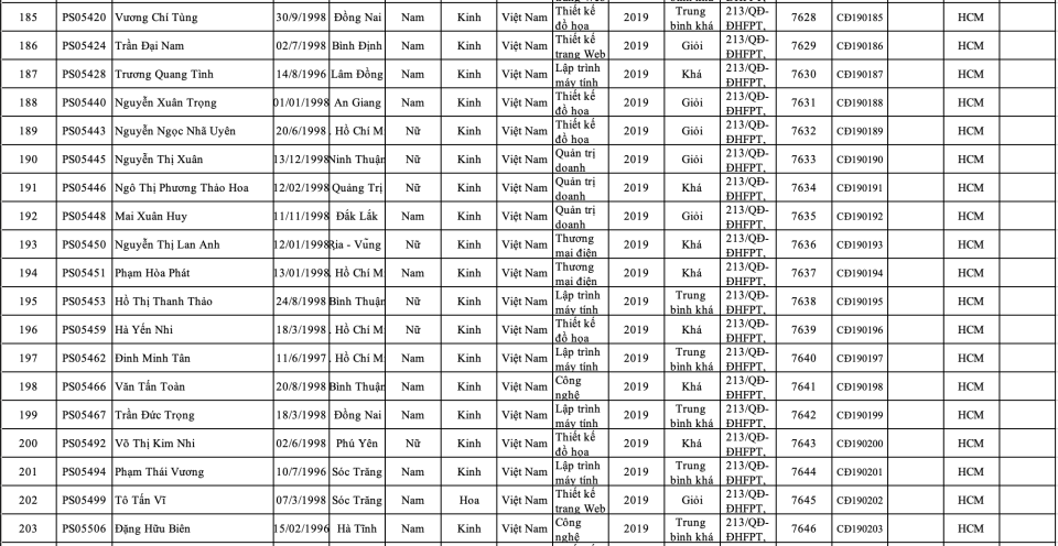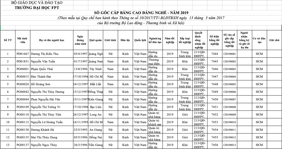 Sổ gốc cấp bằng Cao đẳng nghề - Năm 2019