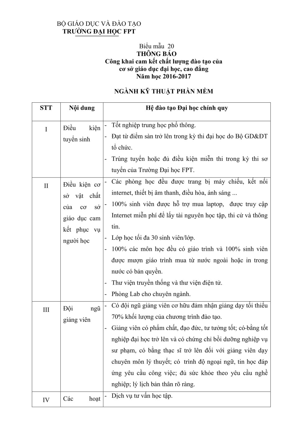 Biểu 20 - Công khai chất lượng đào tạo Đại học - ngành Kỹ thuật phần mềm năm học 2016-2017