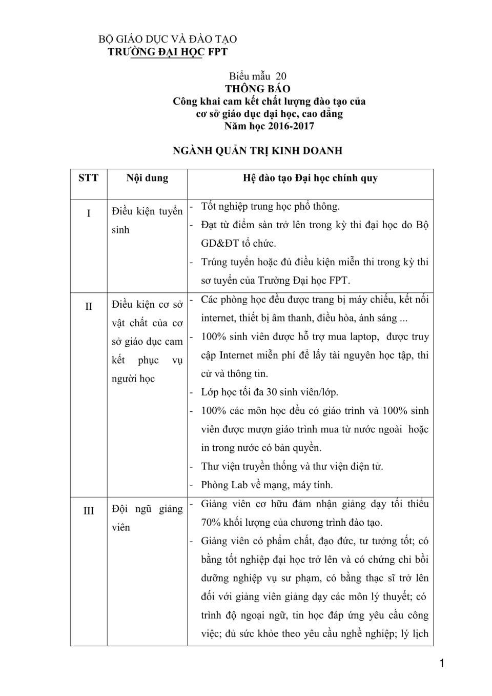 Biểu 20 - Công khai chất lượng đào tạo Đại học - ngành Quản trị kinh doanh năm học 2016-2017
