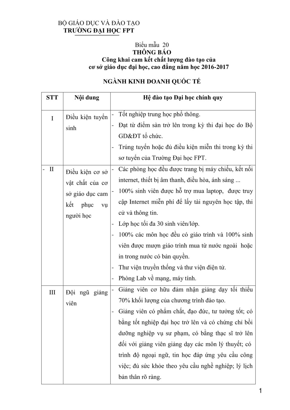 Biểu 20 - Công khai chất lượng đào tạo Đại học - ngành Kinh doanh quốc tế năm học 2016-2017
