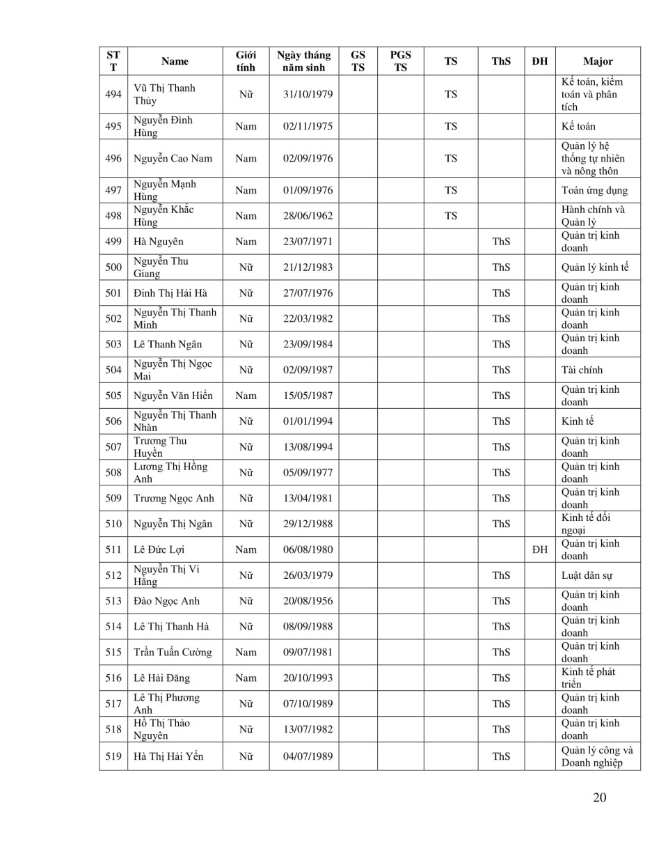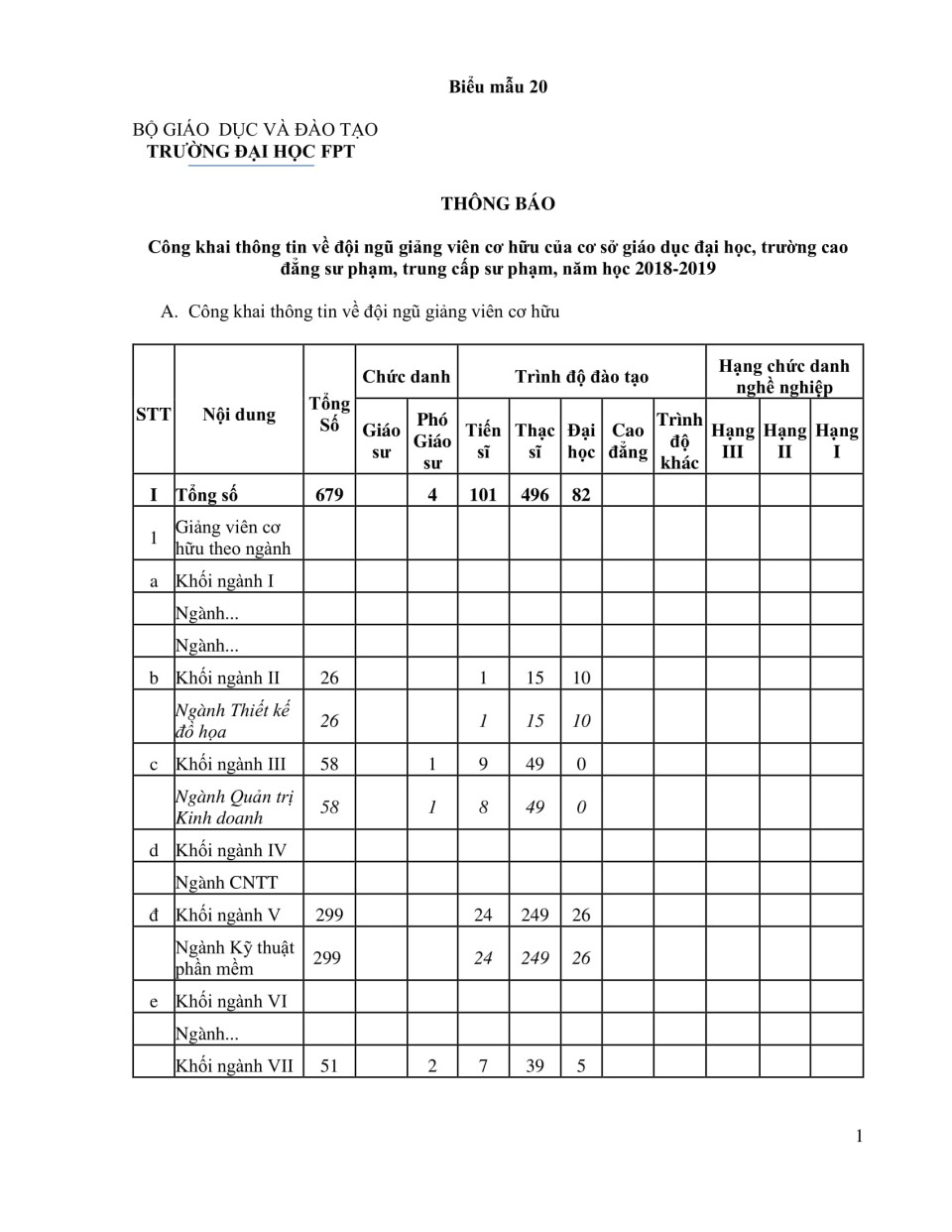Công khai thông tin về đội ngũ GV cơ hữu của cơ sở giáo dục đại học năm học 2018 - 2019