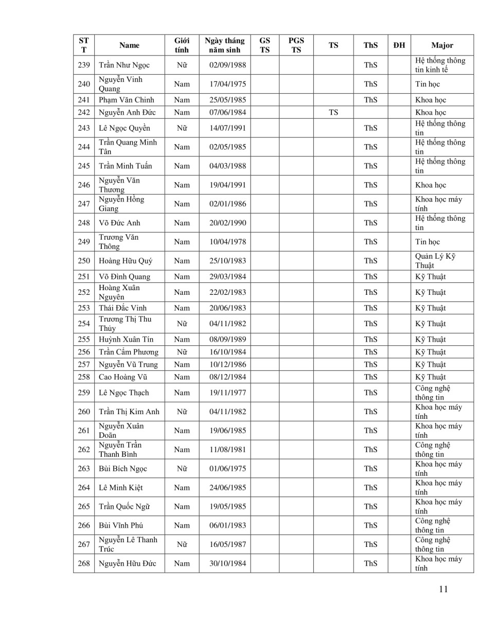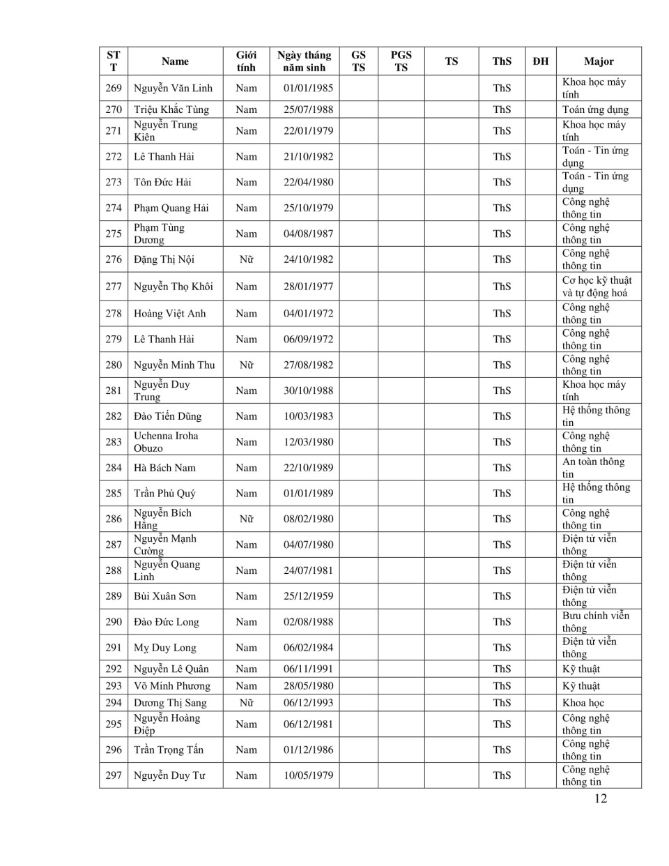 Công khai giảng viên cơ hữu năm học 2011 - 2012