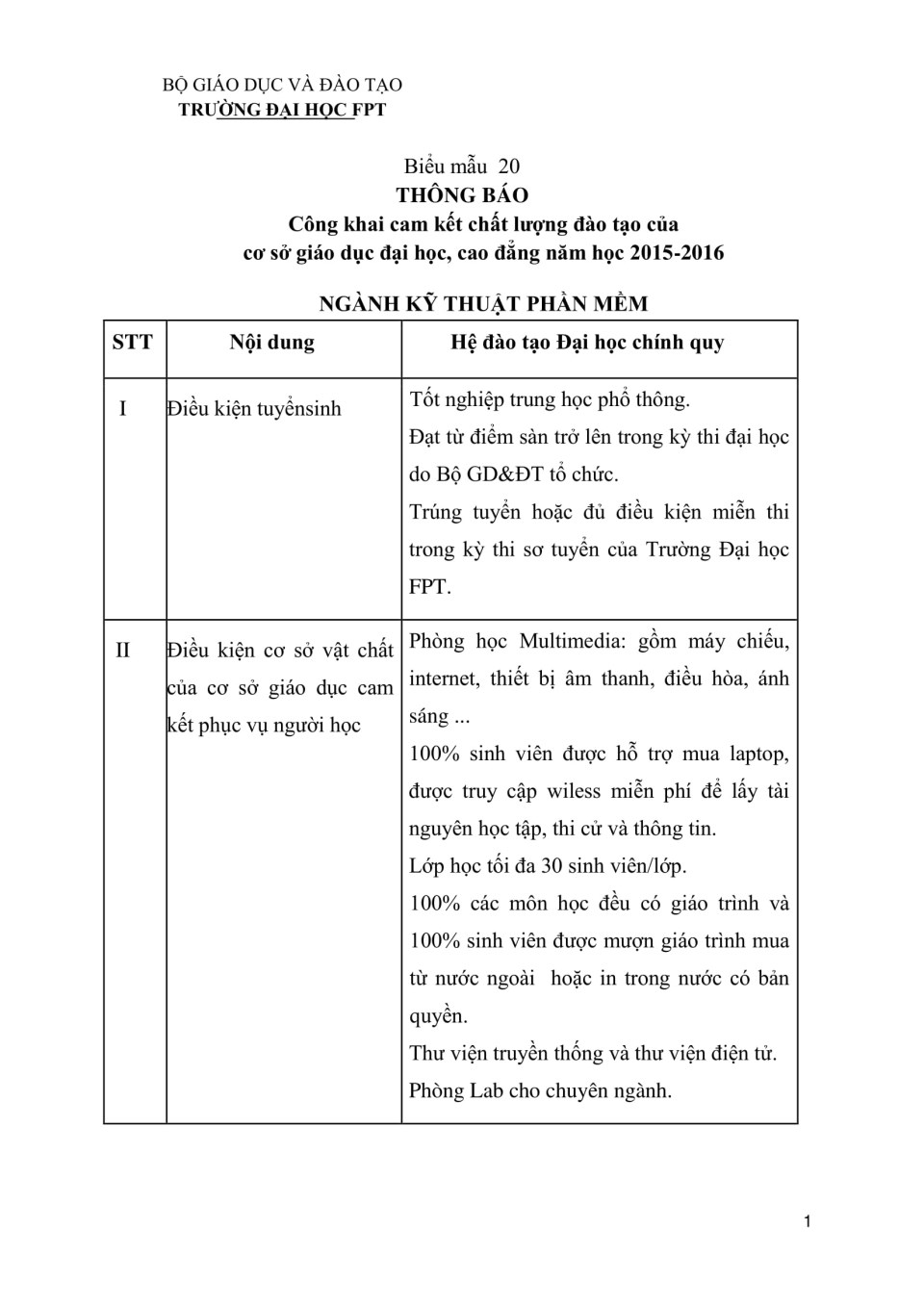 Biểu 20 - Công khai cam kết chất lượng đào tạo ngành Kỹ thuật phần mềm năm 2015 - 2016
