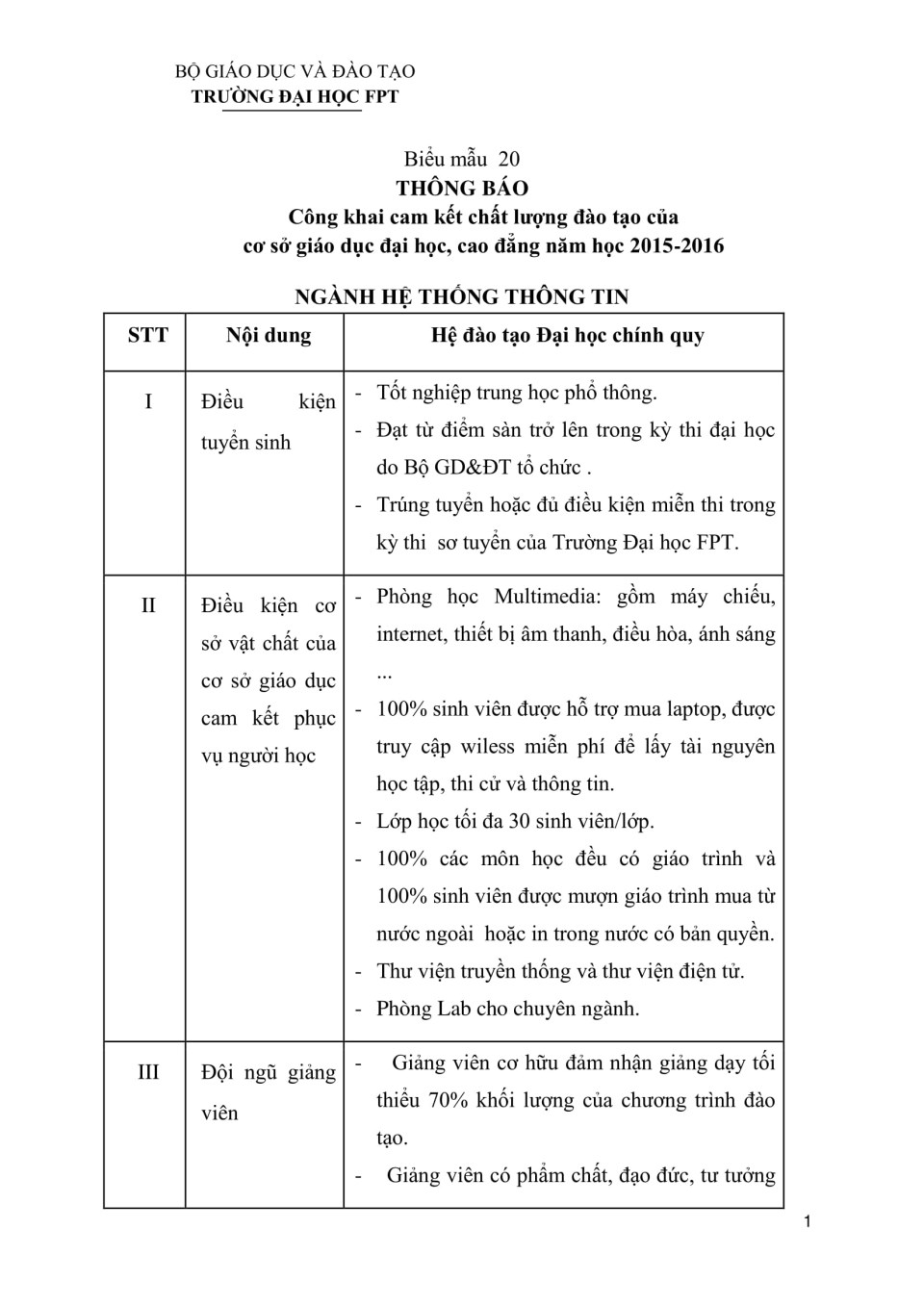 Biểu 20 - Công khai cam kết chất lượng đào tạo ngành Hệ thống thông tin năm 2015 - 2016