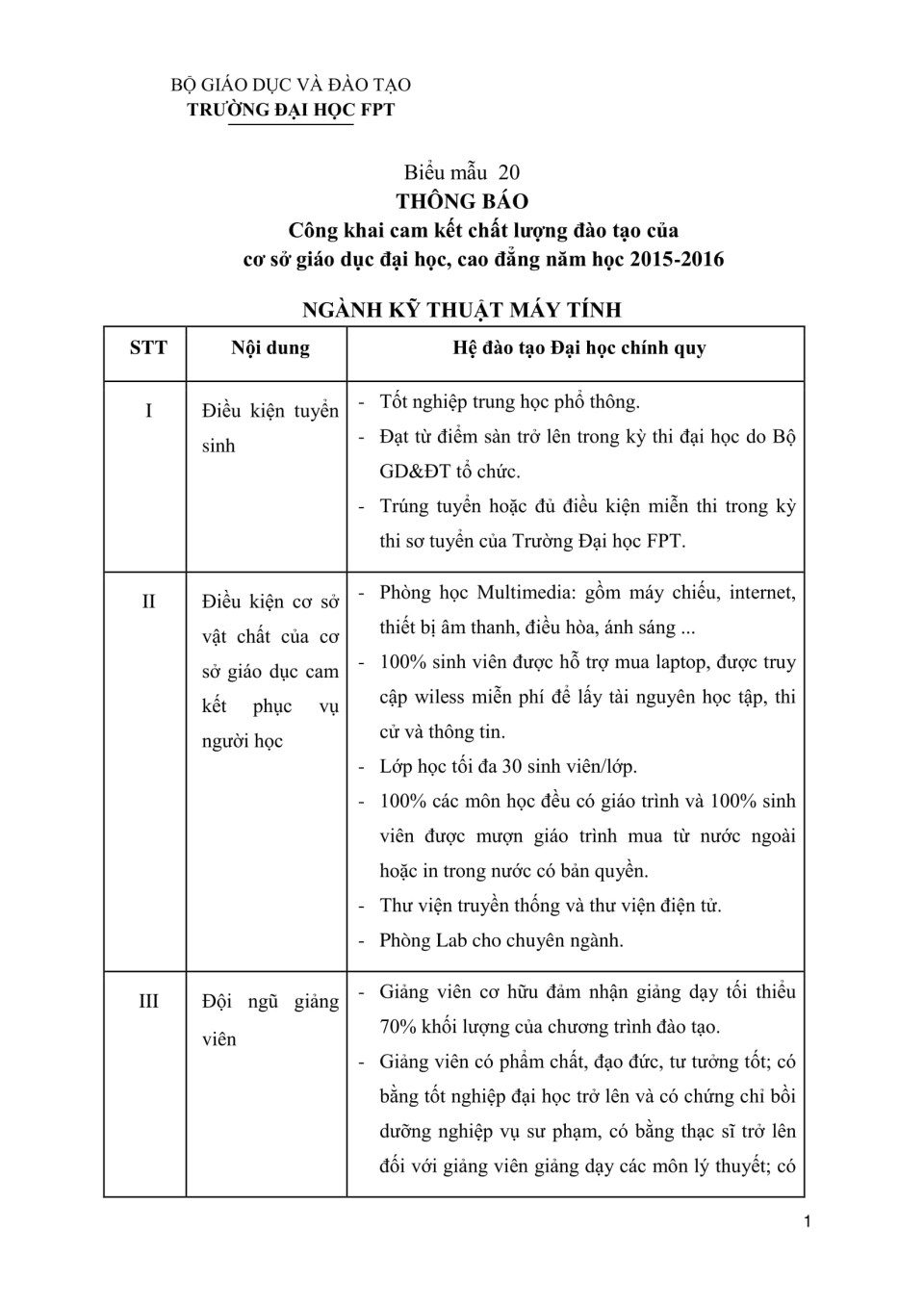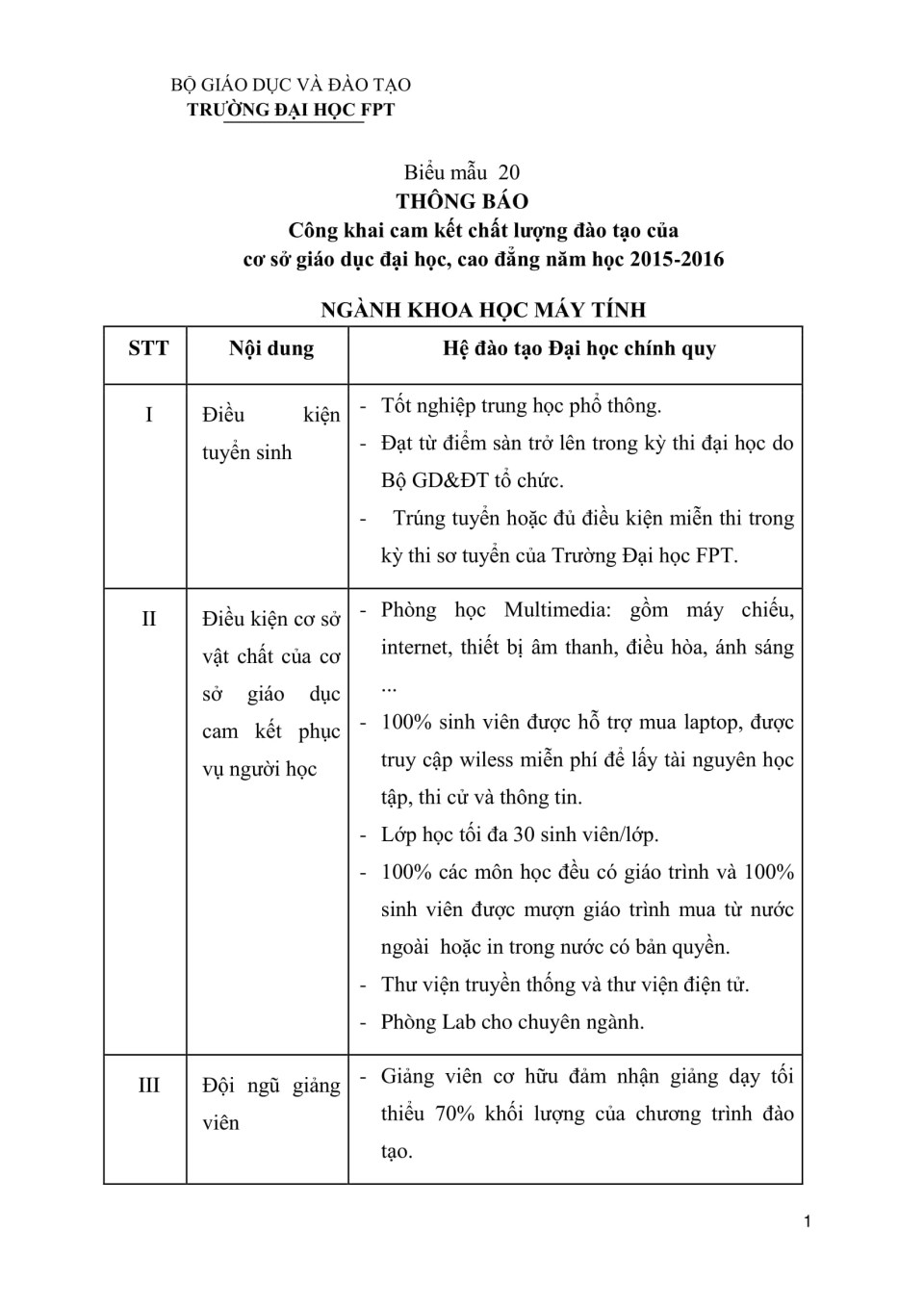Biểu 20 - Công khai cam kết chất lượng đào tạo ngành Khoa học máy tính năm 2015 - 2016