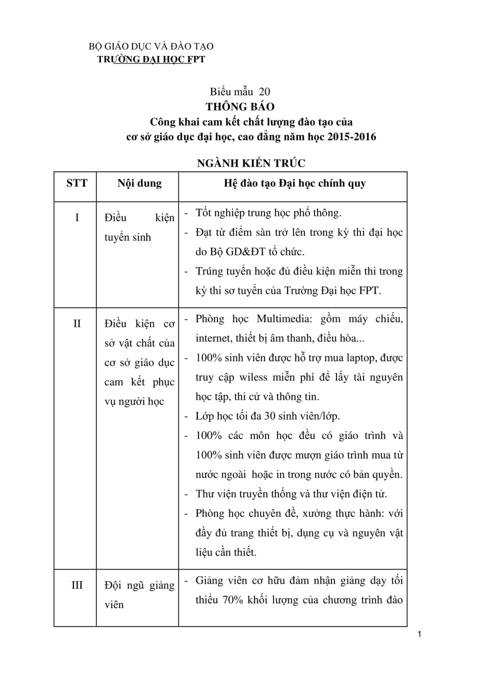 Biểu 20 - Công khai cam kết chất lượng đào tạo ngành Kiến trúc năm 2015 - 2016