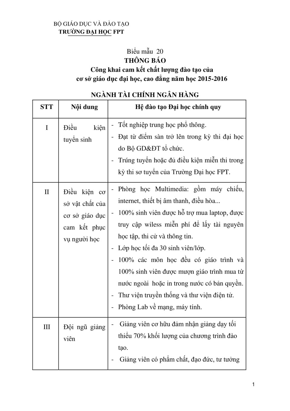 Biểu 20 - Công khai cam kết chất lượng đào tạo ngành Tài chính ngân hàng năm 2015 - 2016