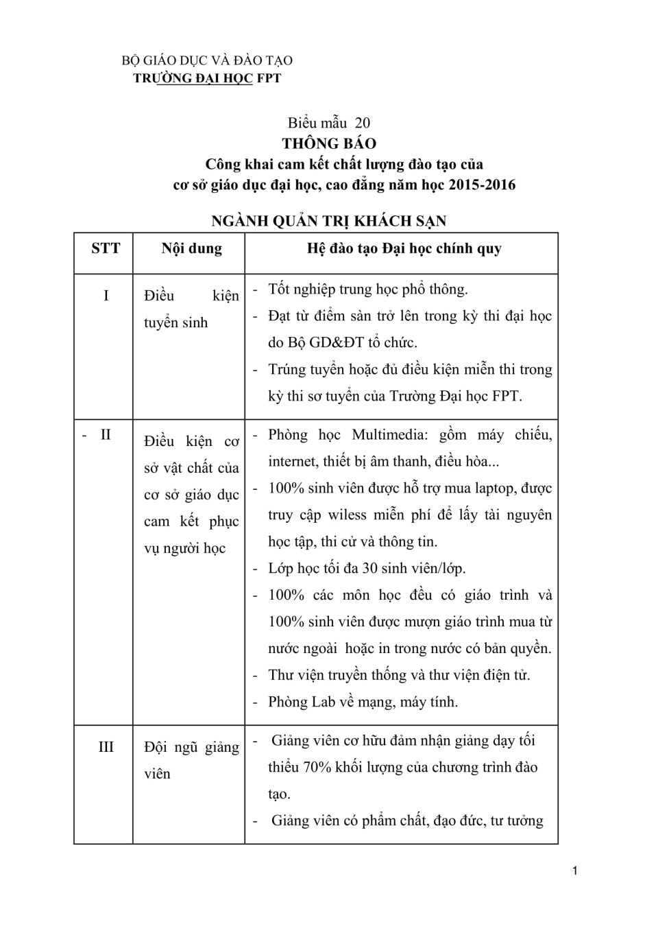 Biểu 20 - Công khai cam kết chất lượng đào tạo ngành Quản trị khách sạn năm 2015 - 2016