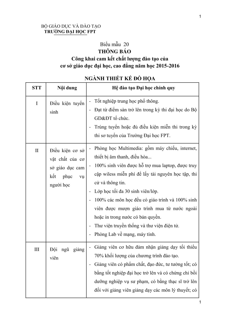 Biểu 20 - Công khai cam kết chất lượng đào tạo ngành Thiết kế đồ hoạ năm 2015 - 2016