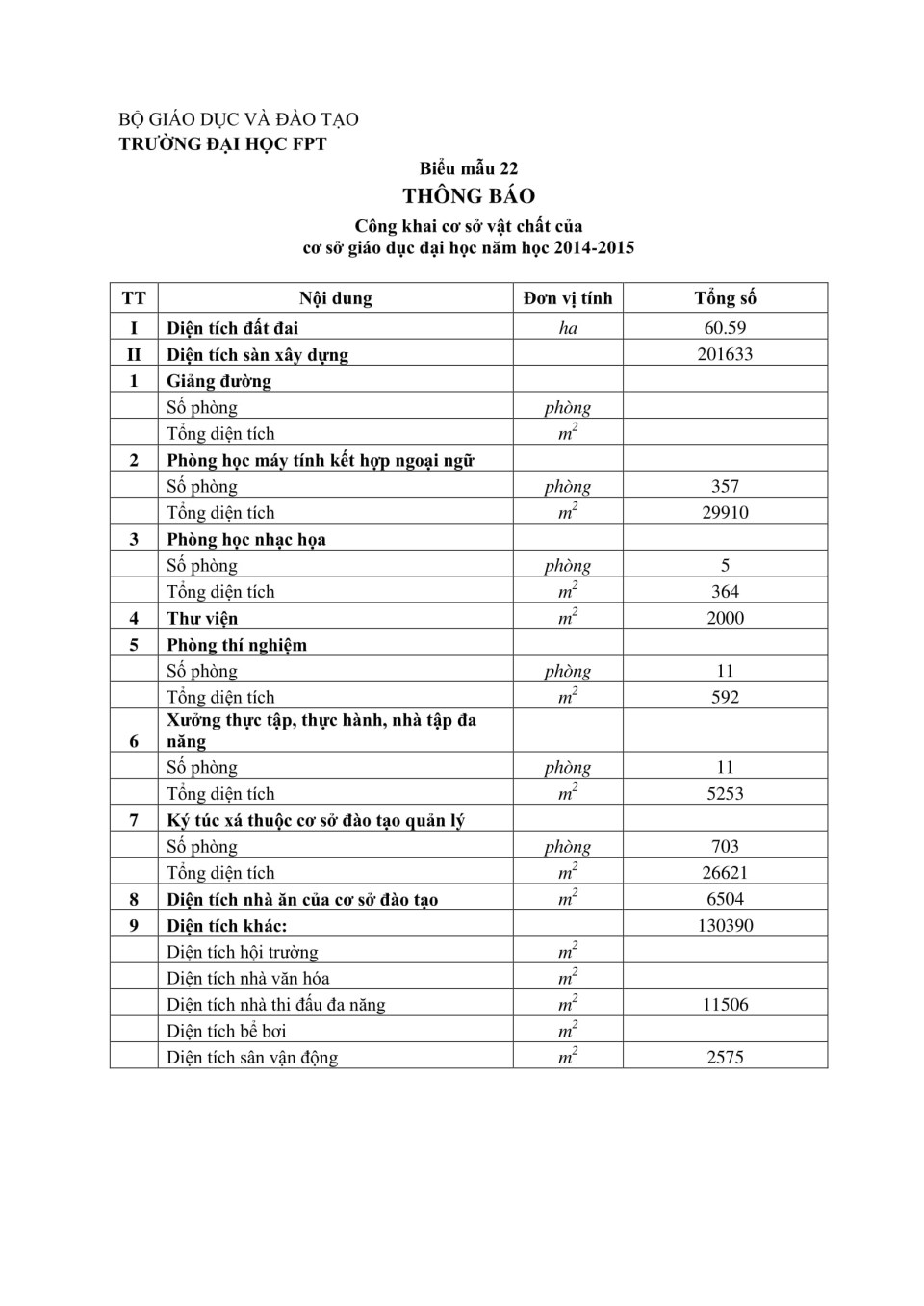 Biểu mẫu 22 - Công khai Cơ sở vật chất năm học 2014 - 2015