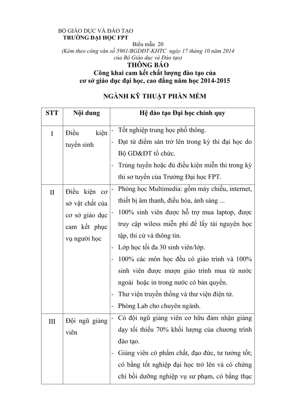 Công khai chất lượng đào tạo ngành Kỹ thuật phần mềm năm học 2014 - 2015