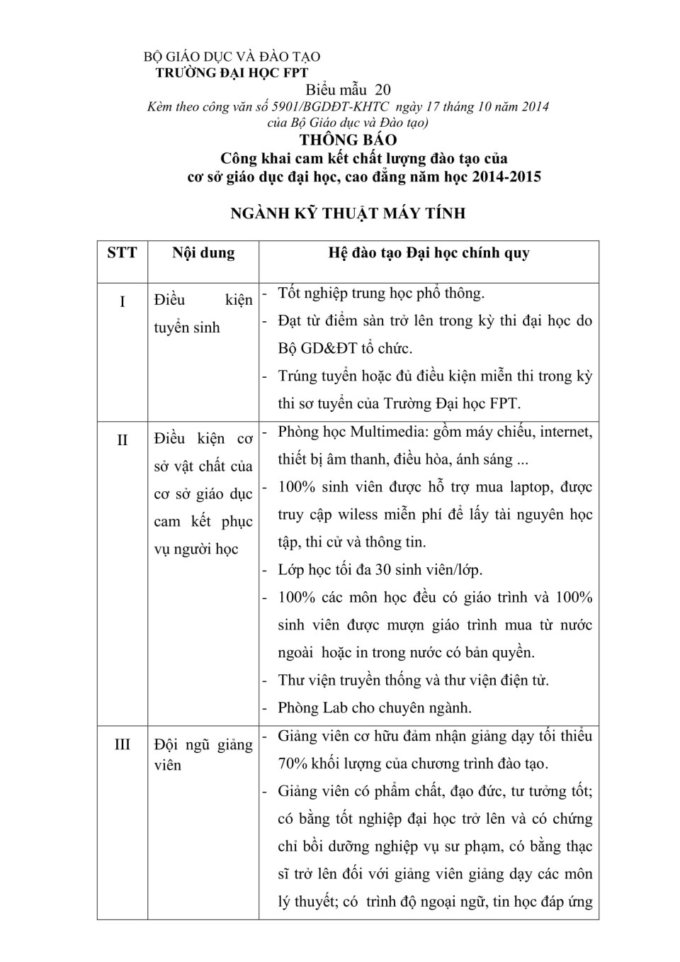 Công khai chất lượng đào tạo ngành Kỹ thuật máy tính năm học 2014 - 2015