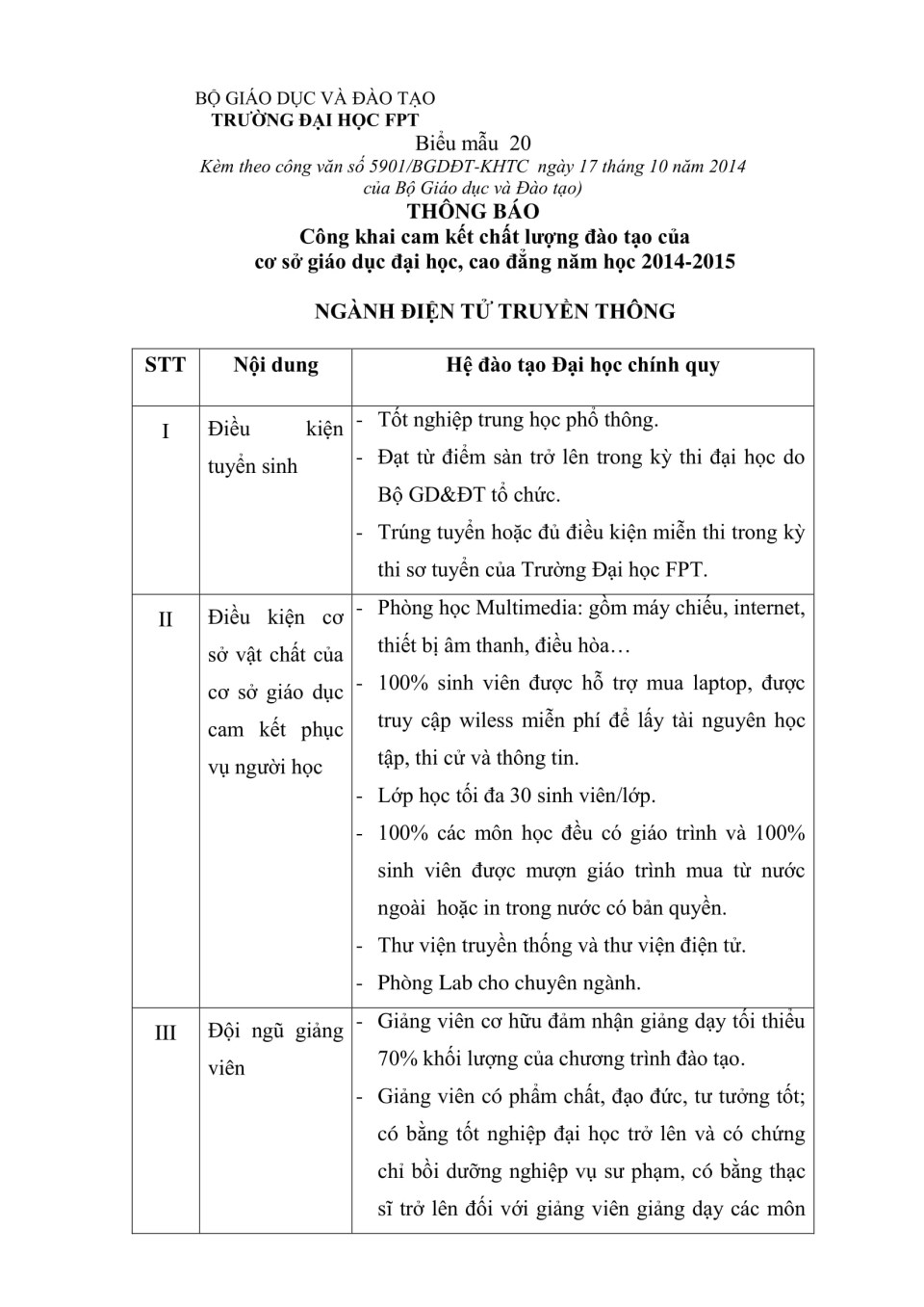 Công khai chất lượng đào tạo ngành Điện tử truyền thông năm học 2014 - 2015