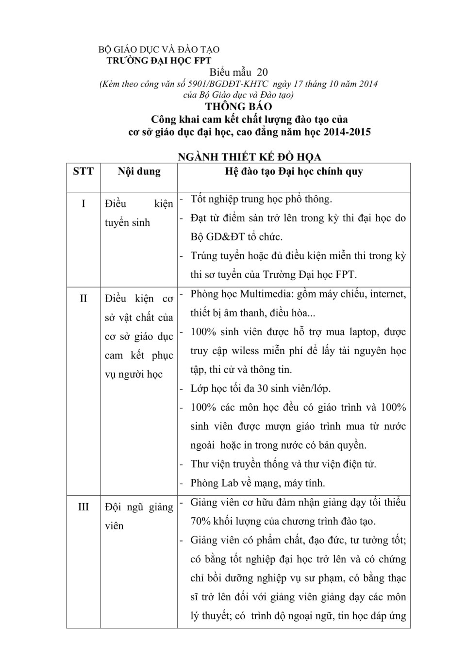 Công khai chất lượng đào tạo ngành Thiết kế đồ hoạ năm học 2014 - 2015