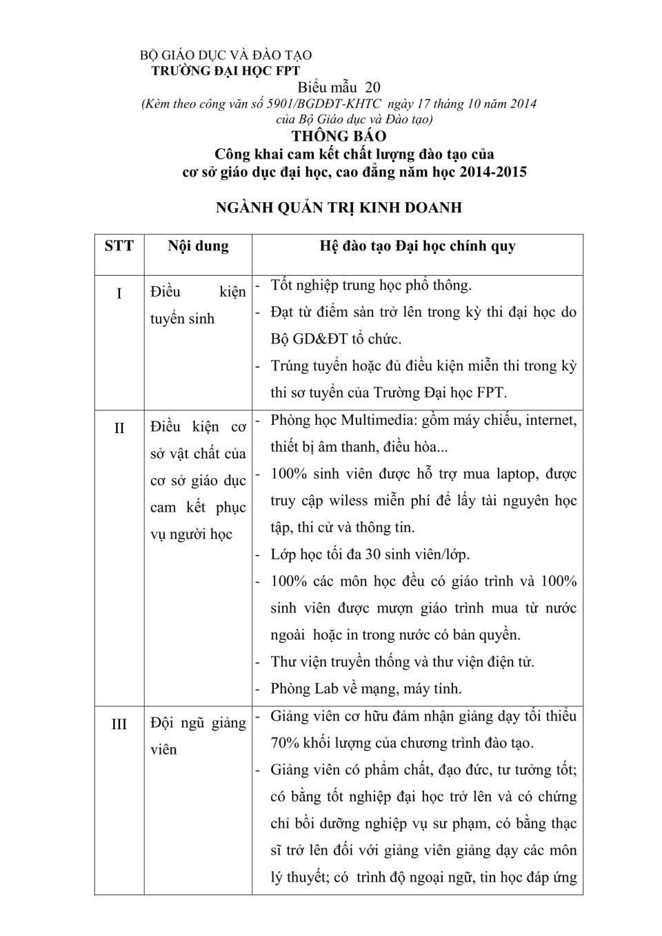 Công khai chất lượng đào tạo ngành Quản trị kinh doanh năm học 2014 - 2015