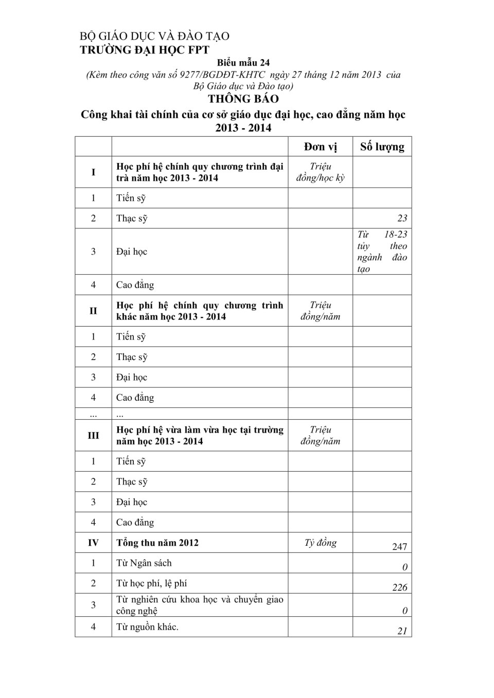 Công khai tài chính của cơ sở giáo dục đại học năm học 2013 - 2014