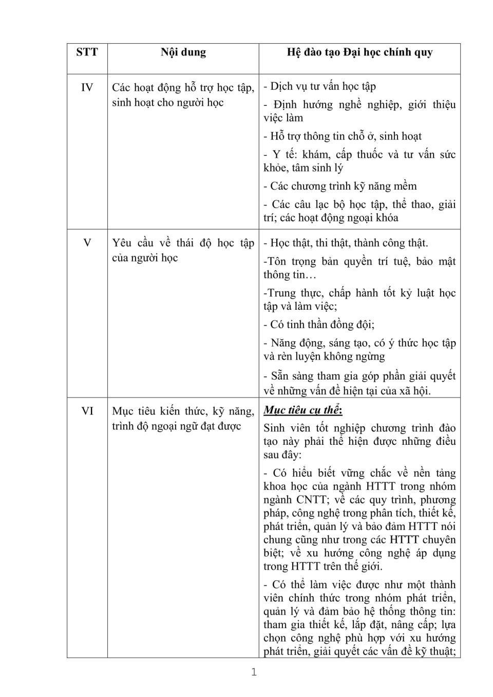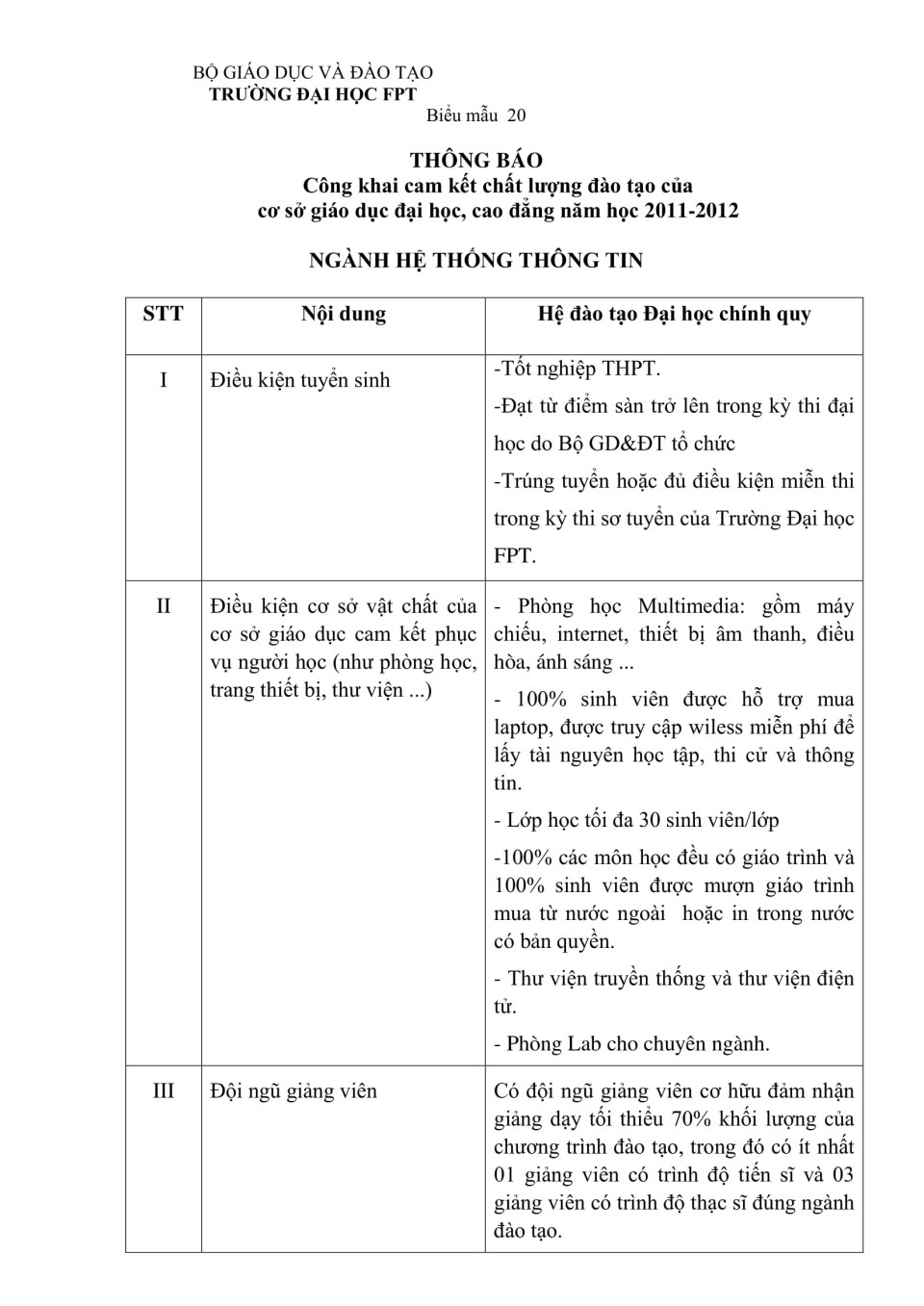 Công khai cam kết chất lượng đào tạo ngành Hệ thống thông tin học 2011 - 2012