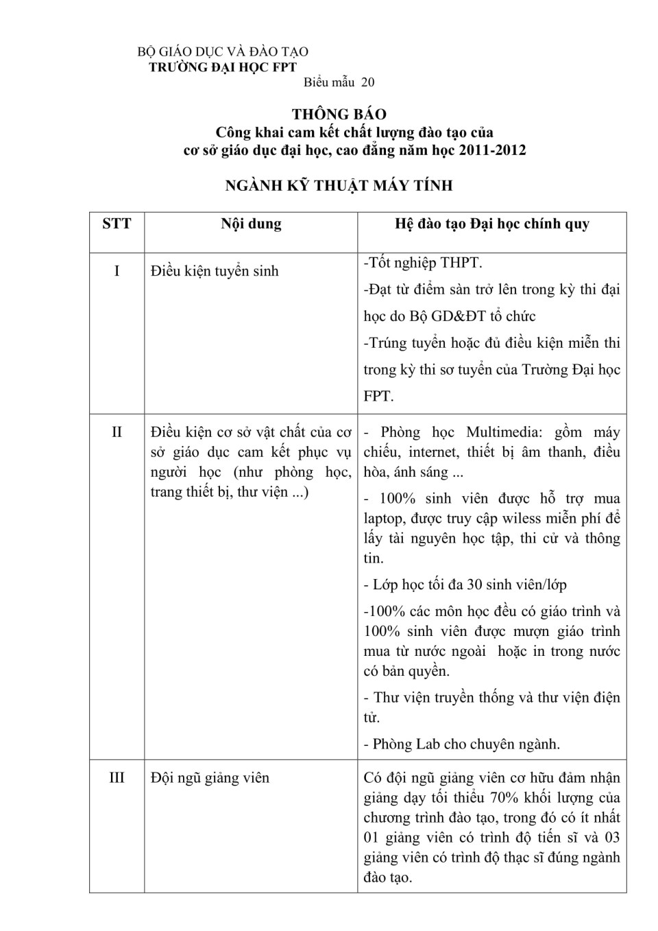 Công khai cam kết chất lượng đào tạo ngành Kỹ thuật máy tính học 2011 - 2012