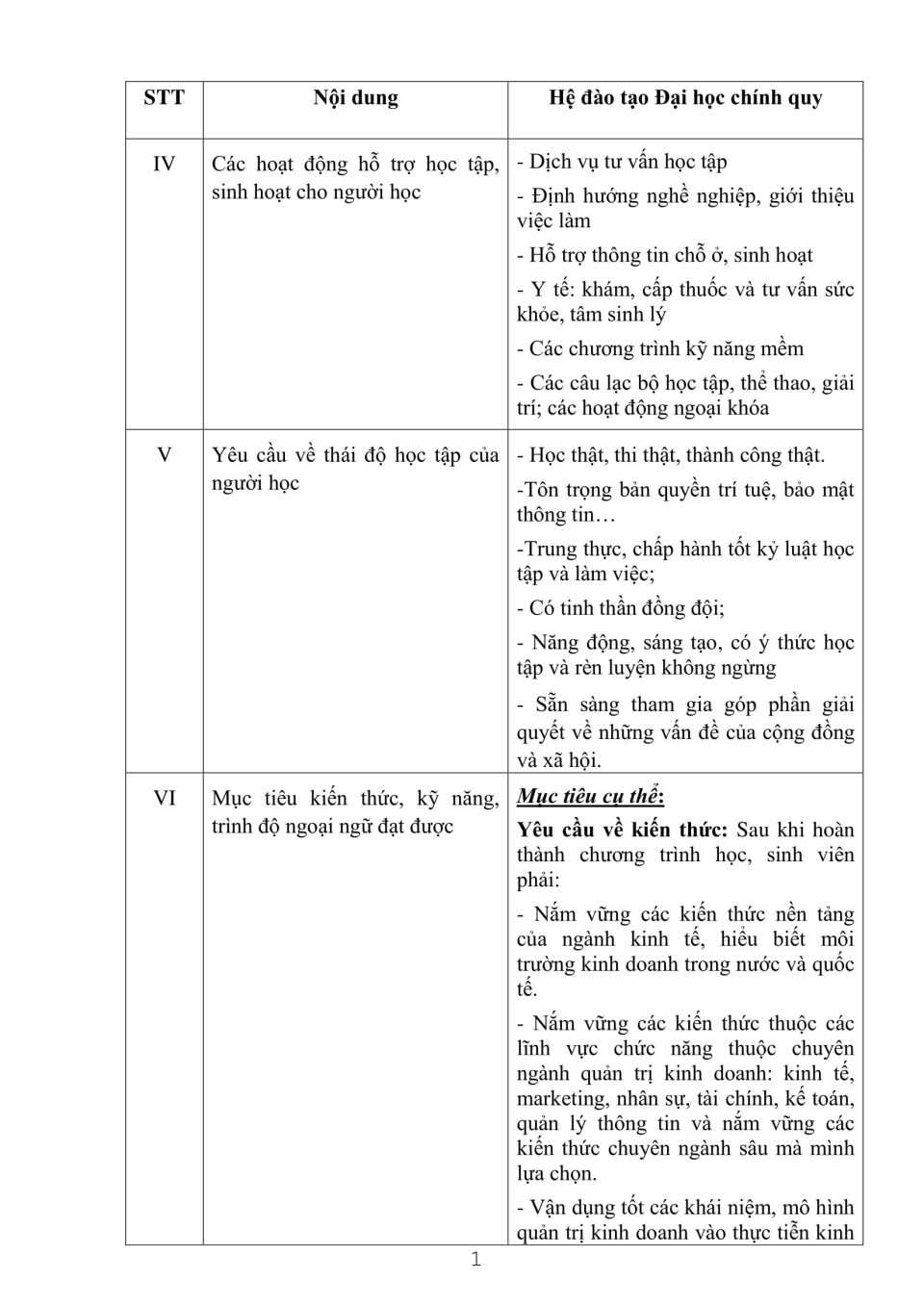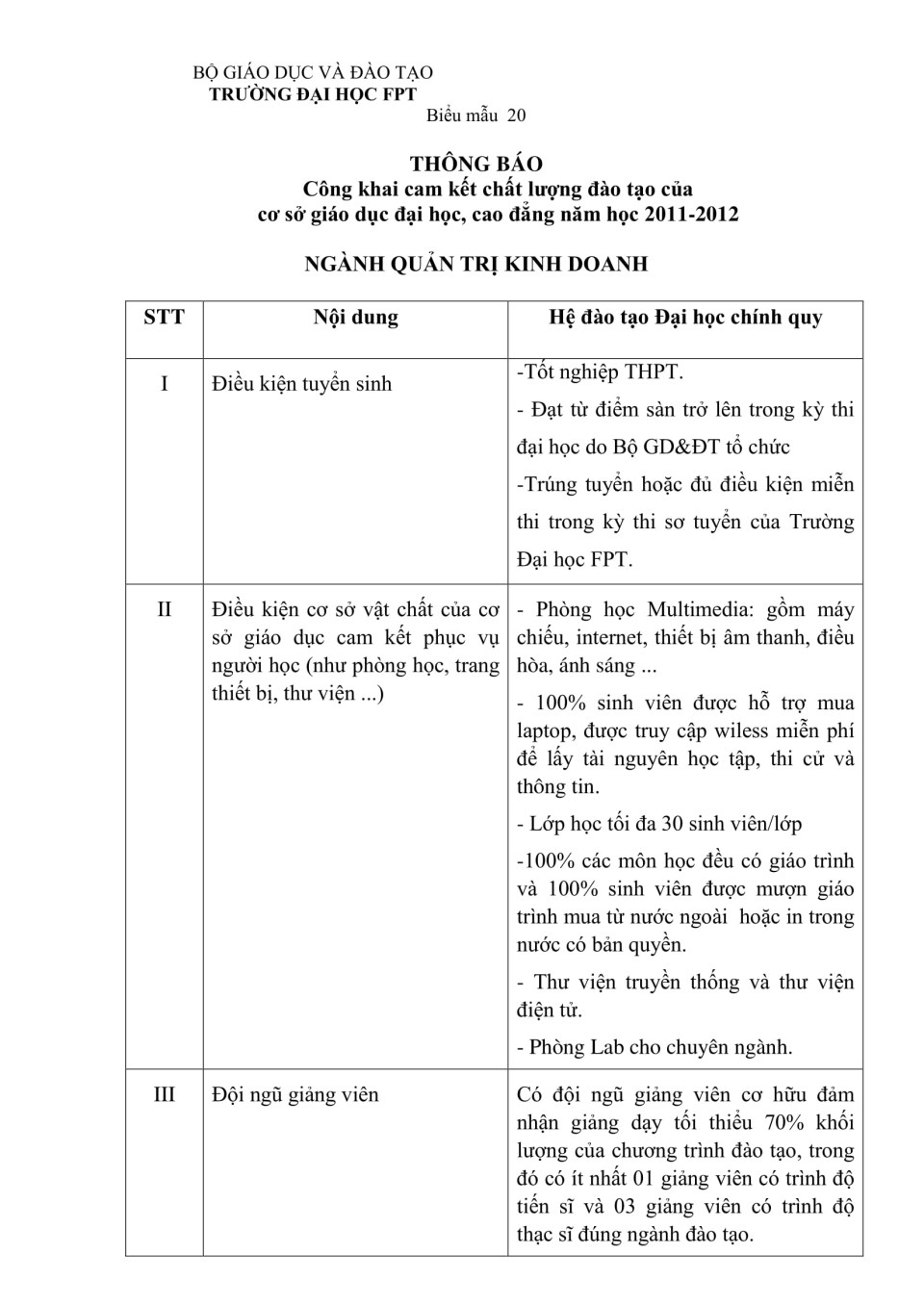 Công khai cam kết chất lượng đào tạo ngành Quản trị kinh doanh năm học 2011 - 2012
