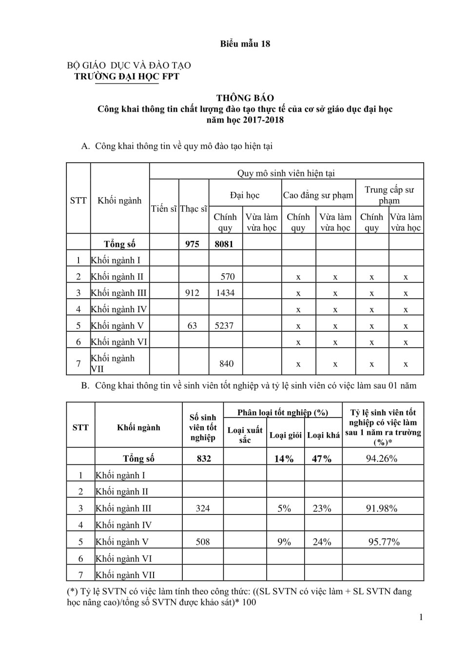 Công khai thông tin chất lượng đào tạo thực tế của cơ sở giáo dục đại học năm học 2017-2018