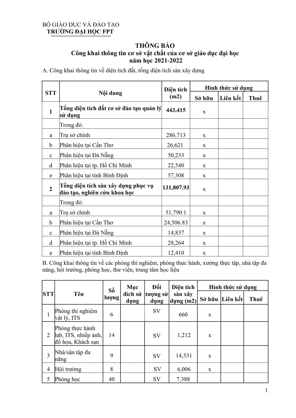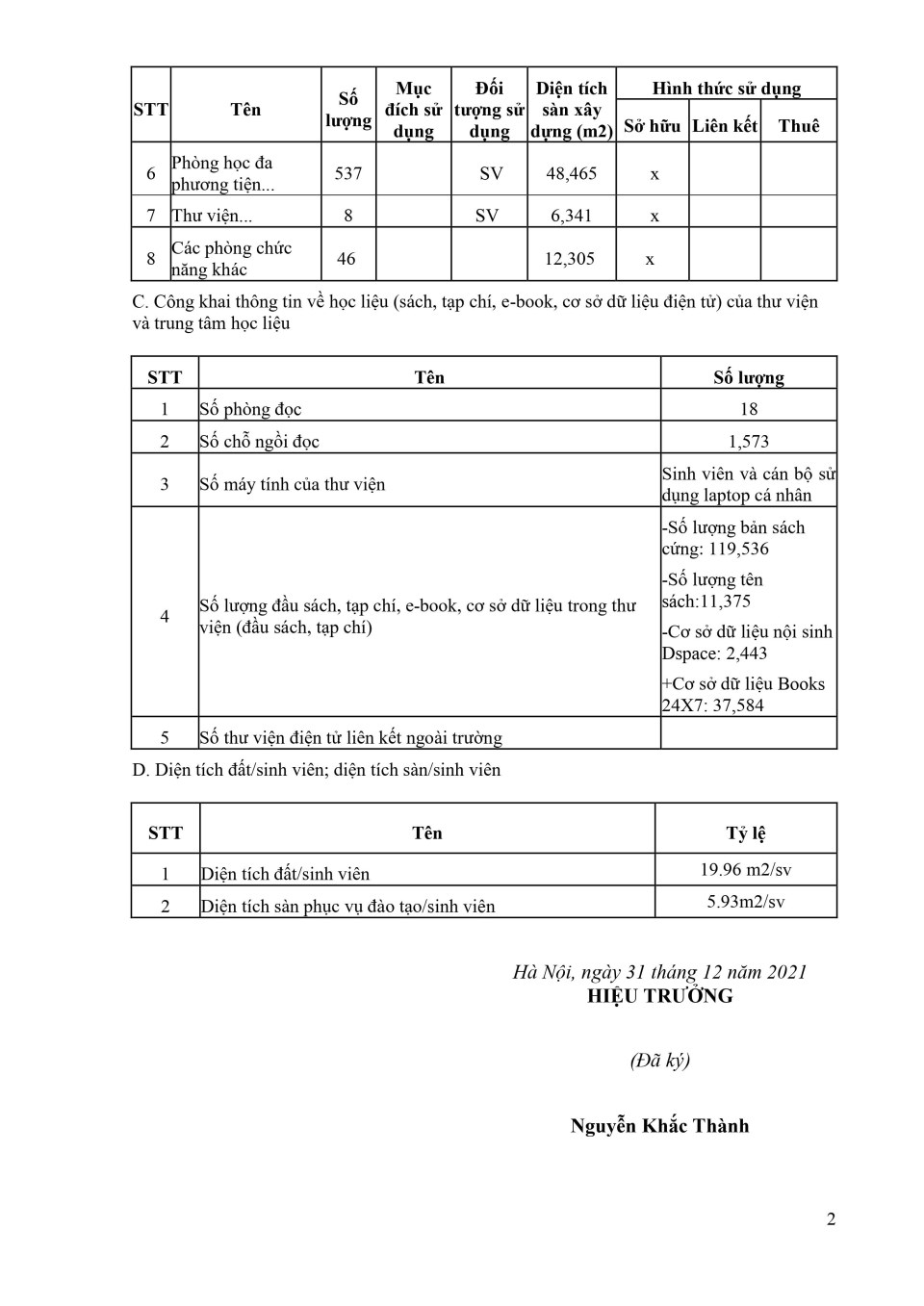 Công khai thông tin cơ sở vật chất của cơ sở giáo dục đại học năm học 2021 - 2022