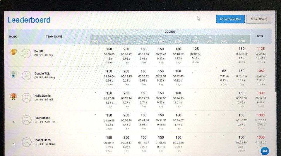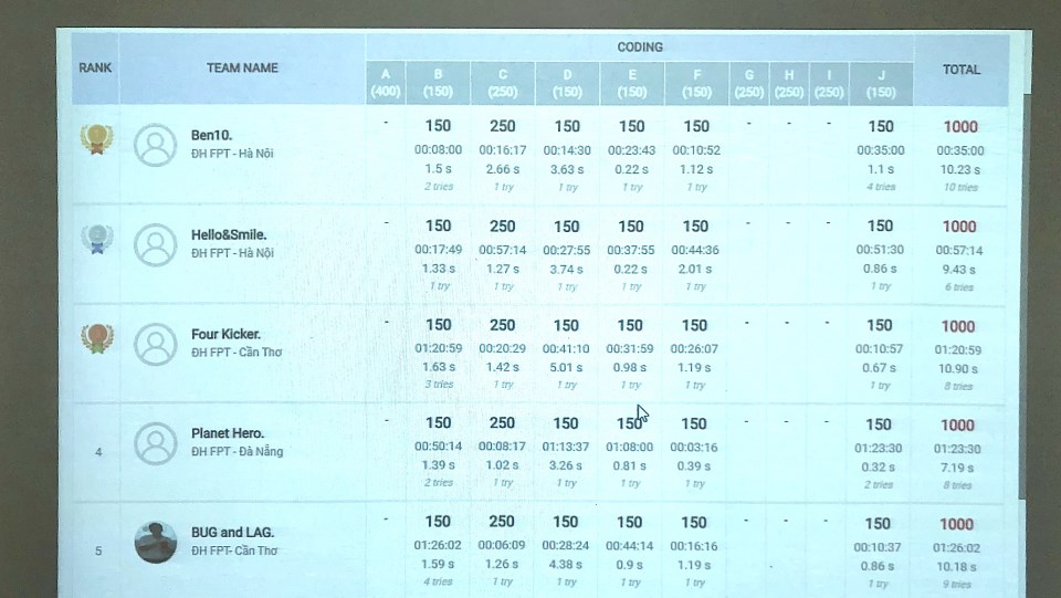 Kết thúc phần thi Codelearn đầu tiên của vòng sơ loại, top 3 đội thi đạt điểm cao nhất gồm: Đội Ben 10 - FPTU Hà Nội, đội Double T&L - FPTU Đà Nẵng và đội Hello&Smile - FPTU Hà Nội