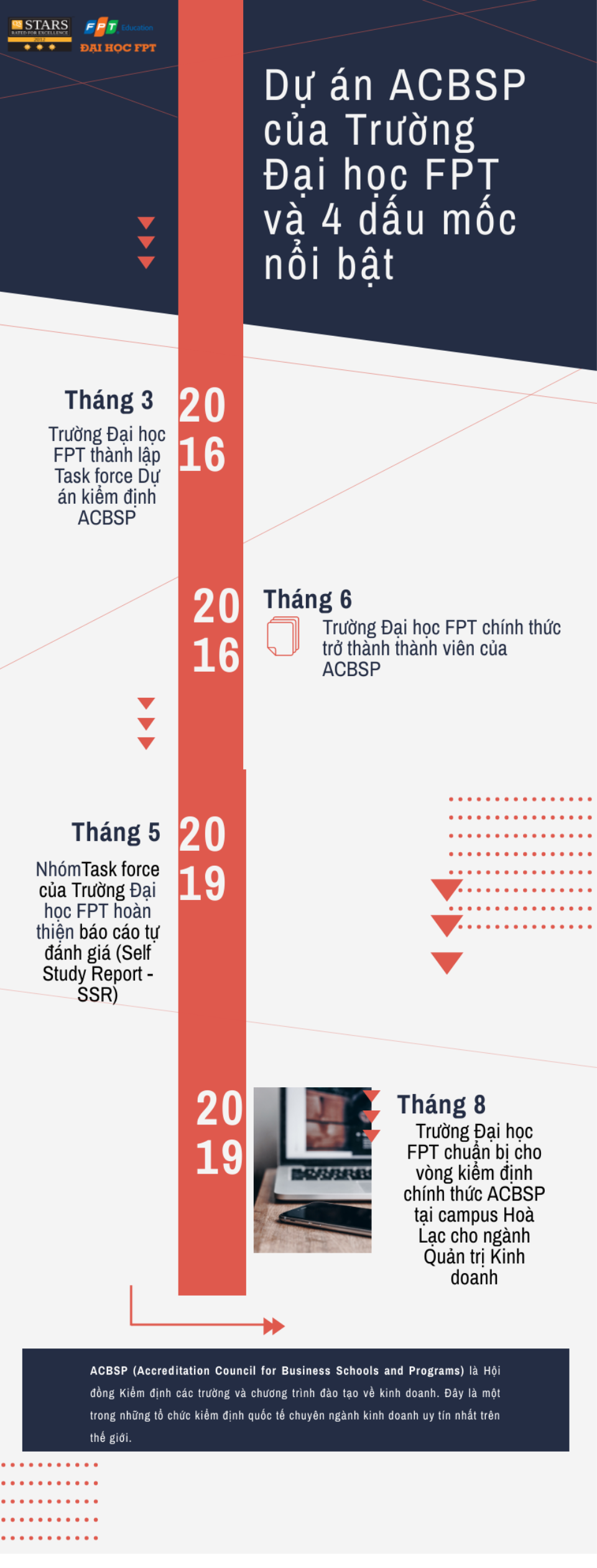 Từ ngày 13/10 – 16/10 tới đây, tổ chức kiểm định ACBSP sẽ thực hiện đánh giá chính thức cho ngành Quản trị kinh doanh tại cơ sở Hòa Lạc của Trường Đại học FPT. Cùng nhìn lại những dấu mốc nổi bật trong Dự án ACBSP của Trường Đại học FPT nhé.