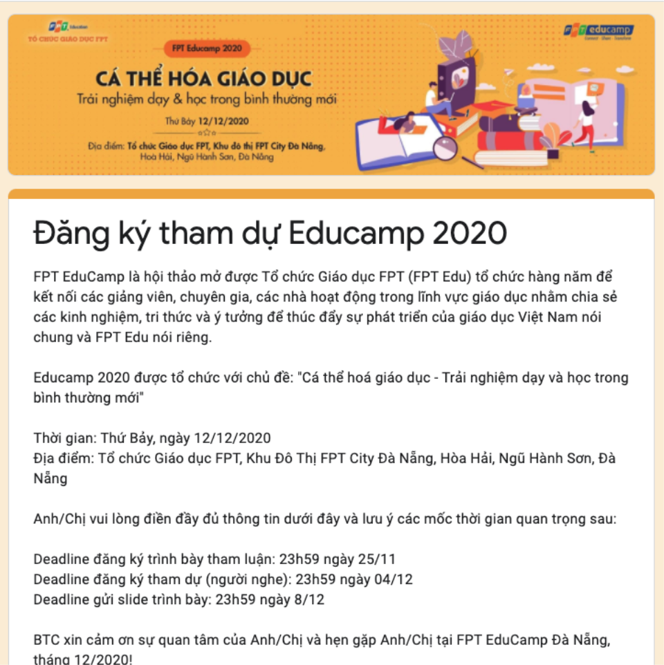 THỜI GIAN – ĐỊA ĐIỂM ĐĂNG KÝ THAM DỰ CHƯƠNG TRÌNH · Ngày hội thảo: Thứ Bảy, 12/12/2020 · Địa điểm: Tổ chức Giáo dục FPT, Khu đô thị FPT City Đà Nẵng, Hoà Hải, Ngũ Hành Sơn, TP. Đà Nẵng · Các mốc thời gian quan trọng: o Dành cho người tham gia trình bày: § Đăng ký trình bày tham luận và gửi tóm tắt: 04/11 - 25/11/2020 § Thông báo danh sách các tham luận trình bày tại hội thảo: 27/11/2020 § Nộp slide powerpoint trình bày: 8/12/2020 o Dành cho người tham dự: § Đăng ký tham dự: 04/11/2020 - 04/12/2020