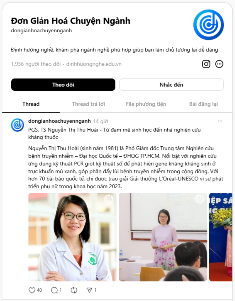 Không chỉ dừng lại ở YouTube, TikTok hay podcast, hệ sinh thái Đơn Giản Hoá Chuyện Ngành còn mở rộng sang nền tảng Threads, một mạng xã hội mới đang rất được Gen Z và Gen Alpha ưa chuộng. Đây là không gian trò chuyện, nơi chia sẻ những gương mặt tiêu biểu trong từng ngành nghề, kể những câu chuyện đời, chuyện nghề ngắn gọn, gần gũi và dễ lan tỏa.