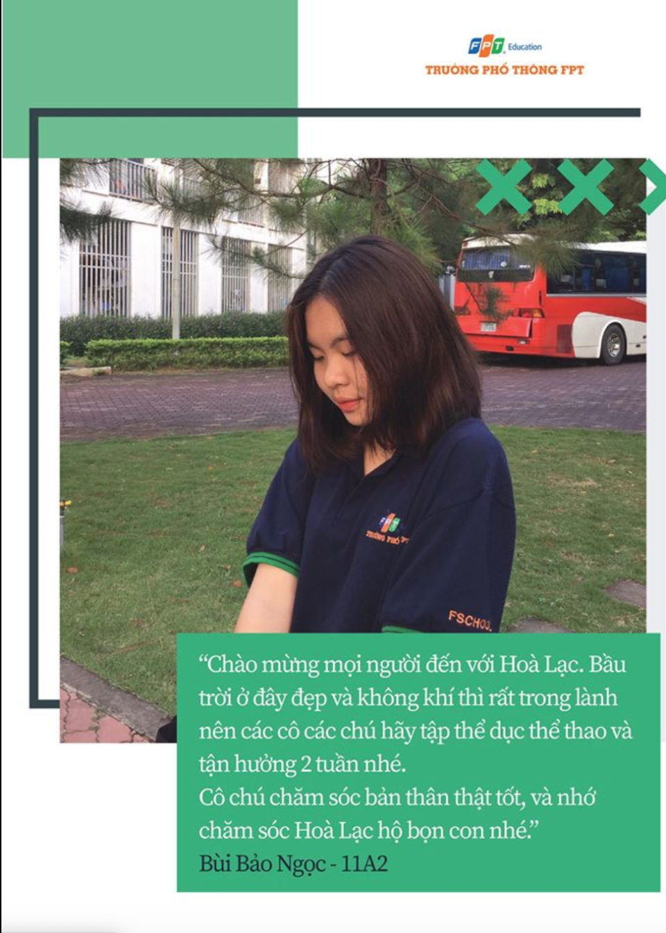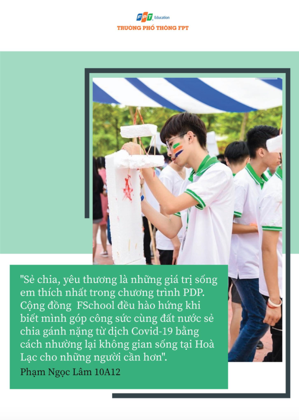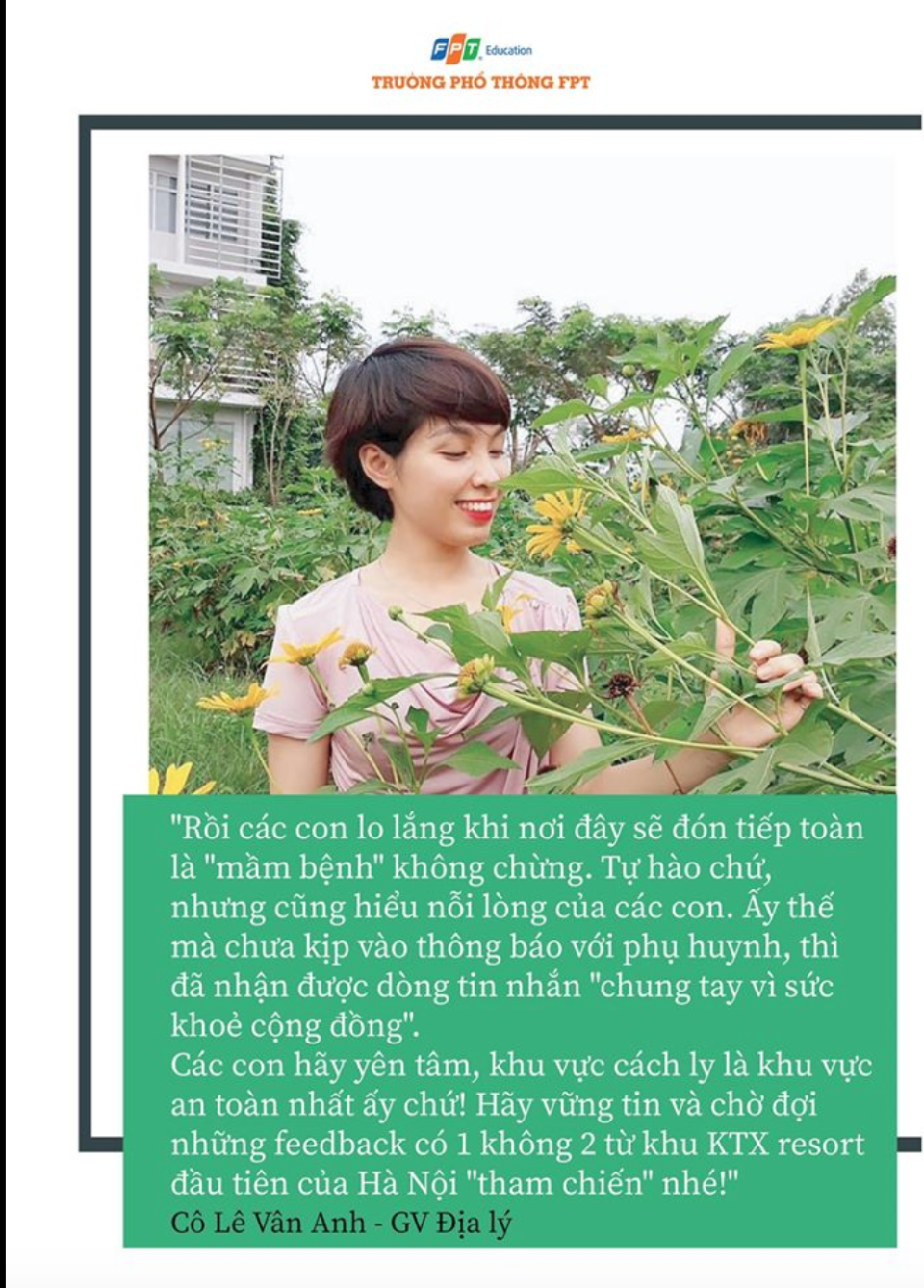 Mới đây, thành phố Hà Nội đã quyết định thành lập khu cách ly tập trung tại Ký túc xá Tổ chức Giáo dục FPT - FPT Edu cho 2.000 người. Hưởng ứng quyết định này, các CBGV và HS của Trường THPT FPT cơ sở Hoà Lạc đã cùng nhau gửi những lời chúc sức khoẻ tới mọi người và bày tỏ niềm tự hào khi được góp sức mình vào cuộc chiến đẩy lùi dịch Covid-19 cùng đất nước.