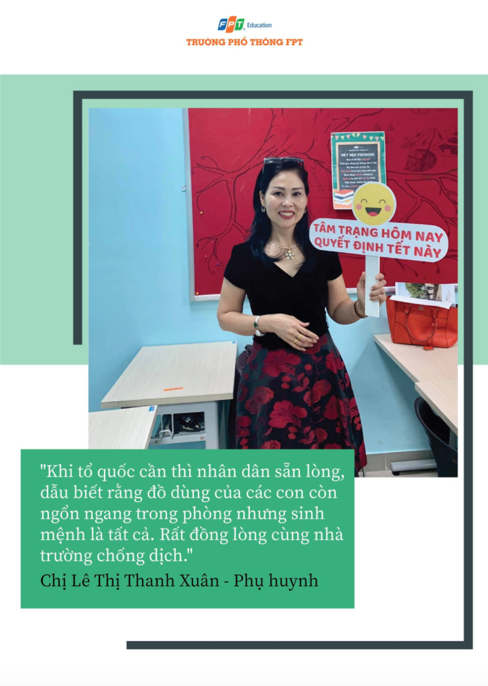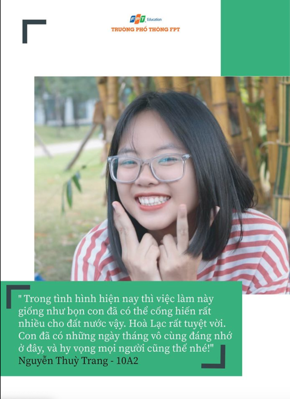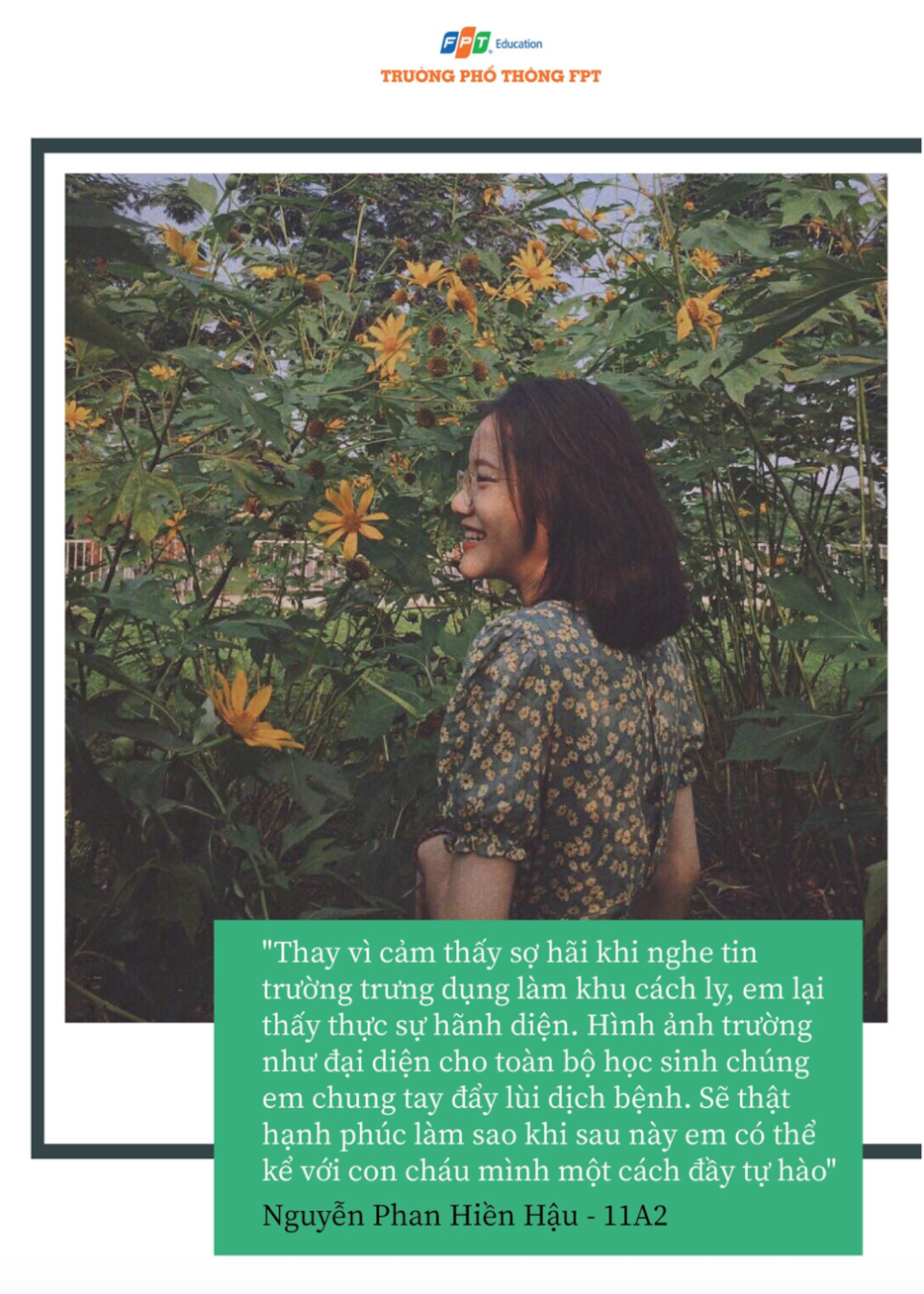 Mới đây, thành phố Hà Nội đã quyết định thành lập khu cách ly tập trung tại Ký túc xá Tổ chức Giáo dục FPT - FPT Edu cho 2.000 người. Hưởng ứng quyết định này, các CBGV và HS của Trường THPT FPT cơ sở Hoà Lạc đã cùng nhau gửi những lời chúc sức khoẻ tới mọi người và bày tỏ niềm tự hào khi được góp sức mình vào cuộc chiến đẩy lùi dịch Covid-19 cùng đất nước.