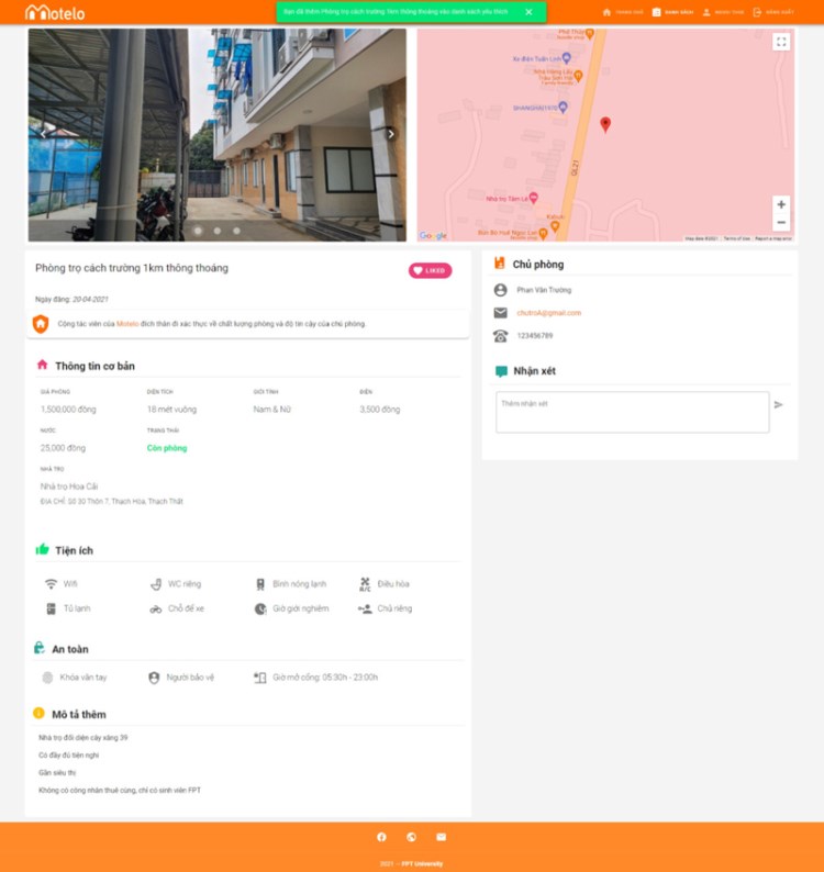 'Trước mắt, nhóm chú trọng phát triển ứng dụng để hỗ trợ tân sinh viên ĐH FPT Hà Nội nên phần bản đồ online sẽ tập trung chi tiết về những điều kiện đặc trưng của khu vực Hòa Lạc. Bản đồ cũng cung cấp tính năng giúp chủ nhà trọ có thể chỉ đường dẫn lối chi tiết đến vị trí nhà cho thuê của mình, giúp cả 2 bên thuê và cho thuê tiết kiệm công sức, thời gian di chuyển cũng như liên lạc.