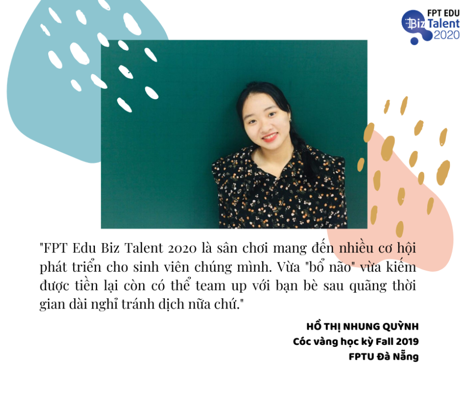 Cóc vàng kỳ Fall 2019 của FPTU Đà Nẵng – Hồ Thị Nhung Quỳnh đánh giá đề bài của FPT Edu Biz Talent năm nay không chỉ “bắt trend” mà còn rất thực tế, mang lại nhiều cơ hội để các bạn sinh viên thể hiện bản lĩnh của mình và phát triển đa kỹ năng, học cùng trải nghiệm. “Tham gia FPT Edu Biz Talent 2020 vừa “bổ não” vừa kiếm được tiền lại còn có thể team up với bạn bè sau quãng thời gian dài nghỉ tránh dịch nữa chứ.” – Nhung Quỳnh chia sẻ.