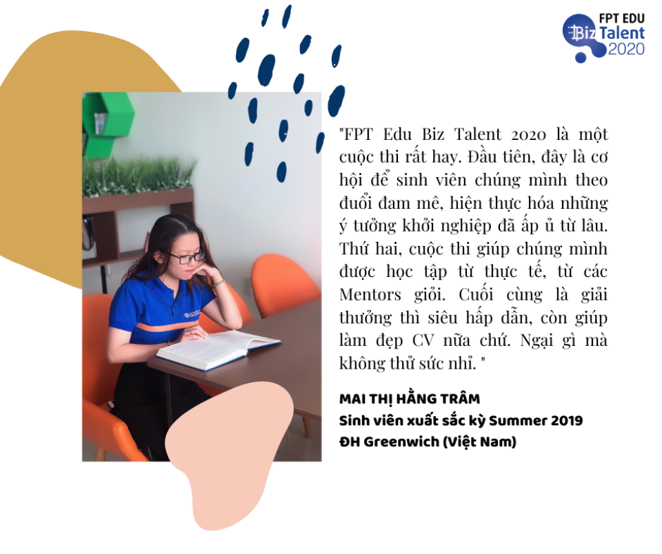 Mai Thị Hằng Trâm – Sinh viên xuất sắc kỳ Summer 2019 của ĐH Greenwich (Việt Nam) thì cực kỳ hào hứng với việc FPT Edu Biz Talent 2020 có thể giúp các bạn sinh viên được học cùng trải nghiệm miễn phí với nhiều Mentor giỏi và nhiệt huyết. “Bên cạnh giải thưởng khủng của chương trình, FPT Edu Biz Talent 2020 còn là cơ hội để các bạn làm đẹp CV và chuẩn bị hành trang cho tương lai của mình.” – Hằng Trâm nói.