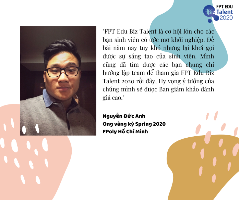 Nguyễn Đức Anh – Ong vàng kỳ Spring 2020 của FPoly Hồ Chí Minh thậm chí đã lập team và đang lên ý tưởng để tham gia FPT Edu Biz Talent 2020. Đức Anh cũng chia sẻ rằng đề bài năm nay tuy khó nhưng cũng rất thú vị, khơi gợi nhiều sáng tạo cho các bạn sinh viên.