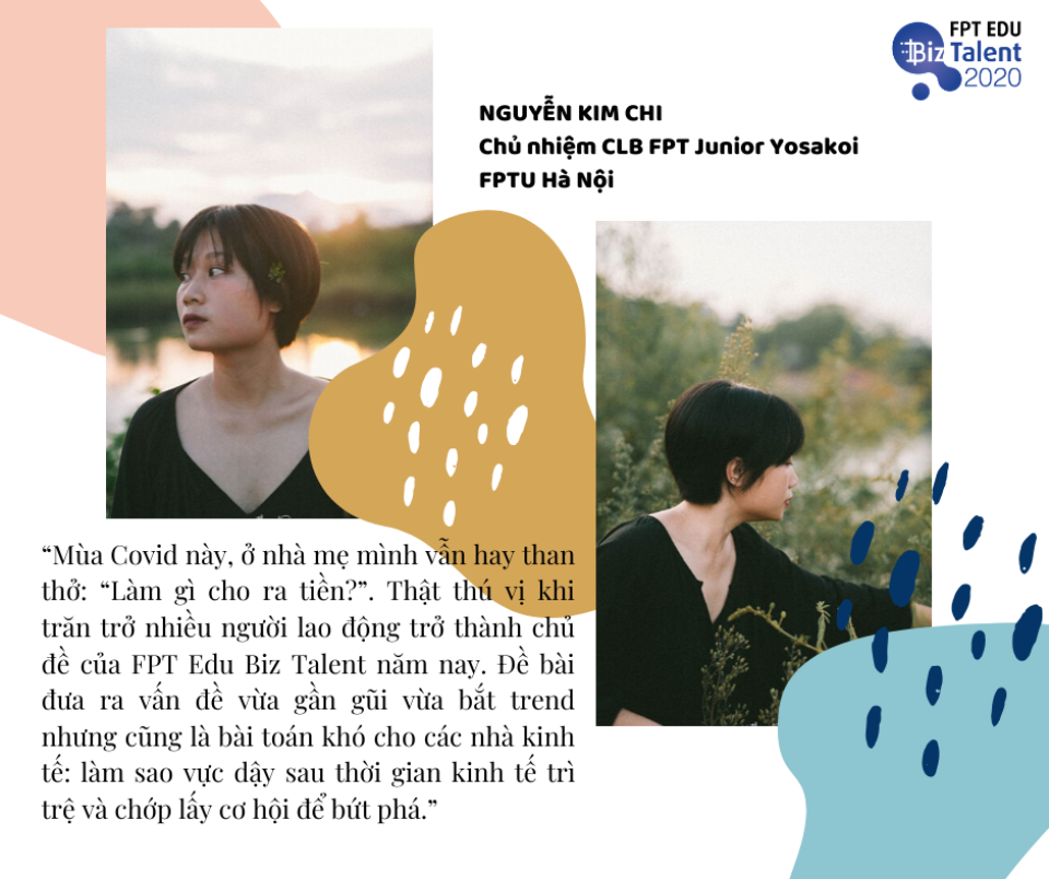 Nữ chủ nhiệm của CLB Junior Yosakoi của FPTU Hà Nội – Nguyễn Kim Chi (Chi Dùa) hài hước khi nhận xét về chủ đề cuộc thi: “Mùa Covid này, ở nhà mẹ mình vẫn hay than thở: “Làm gì cho ra tiền?”. Thật thú vị khi trăn trở nhiều người lao động trở thành chủ đề của FPT Edu Biz Talent năm nay. Đề bài đưa ra vấn đề vừa gần gũi vừa bắt trend nhưng cũng là bài toán khó cho các nhà kinh tế: làm sao vực dậy sau thời gian kinh tế trì trệ và chớp lấy cơ hội để bứt phá.”