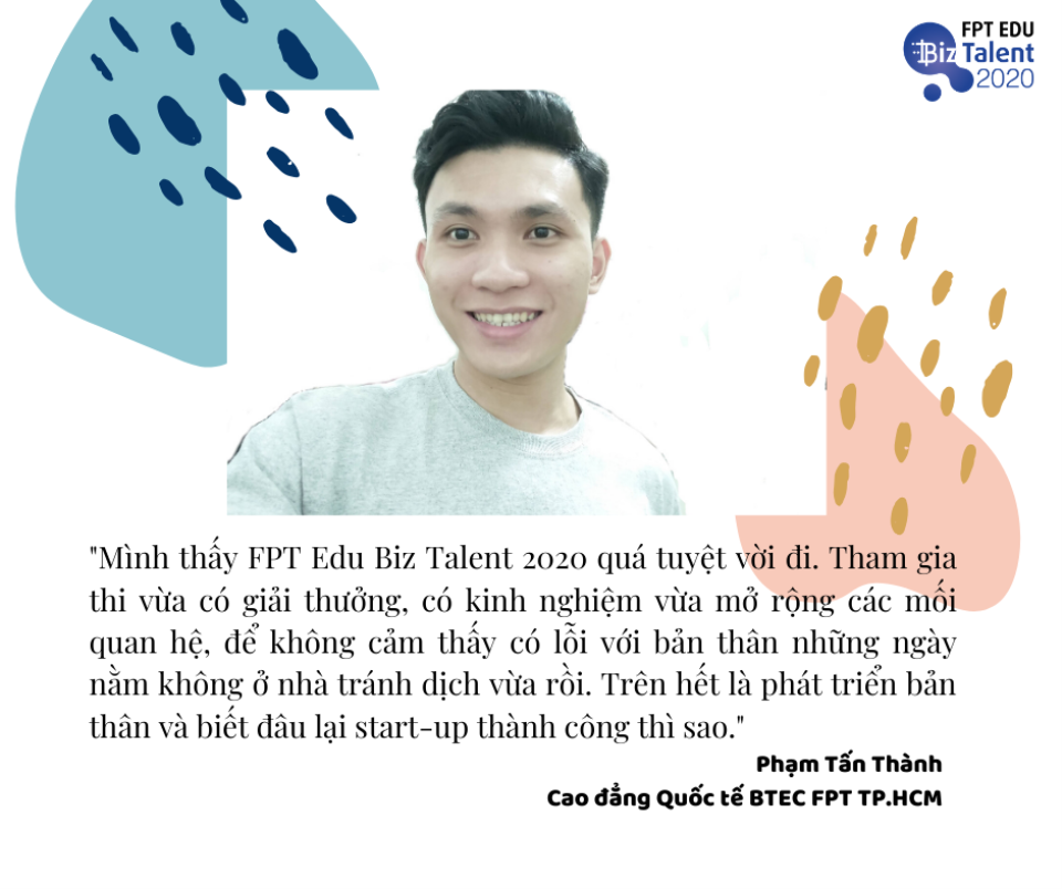 Cậu bạn Phạm Tấn Thành của Cao đẳng Quốc tế BTEC FPT TP.HCM lại hóm hỉnh cho rằng tham gia FPT Edu Biz Talent 2020 cũng là một cách hoàn hảo để bù đắp những “lỗi lầm” của bản thân mình khi đã... nghỉ ngơi quá nhiều trong đợt nghỉ dịch vừa rồi. Đây là cơ hội giúp những bạn tham gia học cùng trải nghiệm bổ ích.