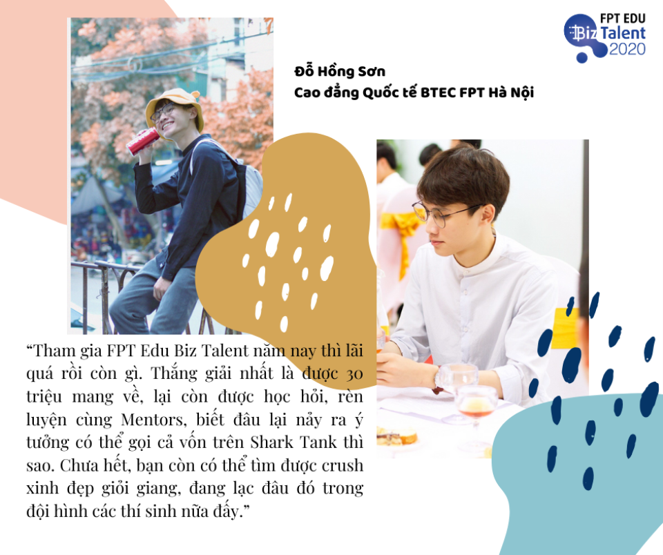 Đỗ Hồng Sơn – sinh viên nổi bật của chuyên ngành Quản trị kinh doanh tại Cao đẳng Quốc tế BTEC FPT Hà Nội thì nhận định tham gia FPT Edu Biz Talent năm nay là cực kỳ... lãi đấy nhé.