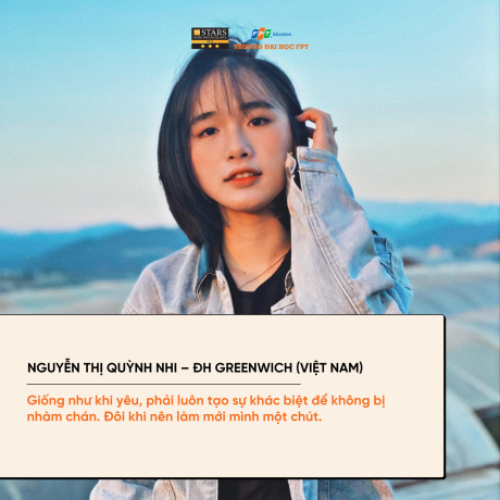 Ở ĐH FPT, mình thích nhất là không quan trọng hình thức như cách ăn mặc, tóc tai... mà chỉ tập trung vào nội dung. Vì không bị giới hạn nên tất cả những"nội dung" là chúng mình đều sáng tạo và mới lạ.