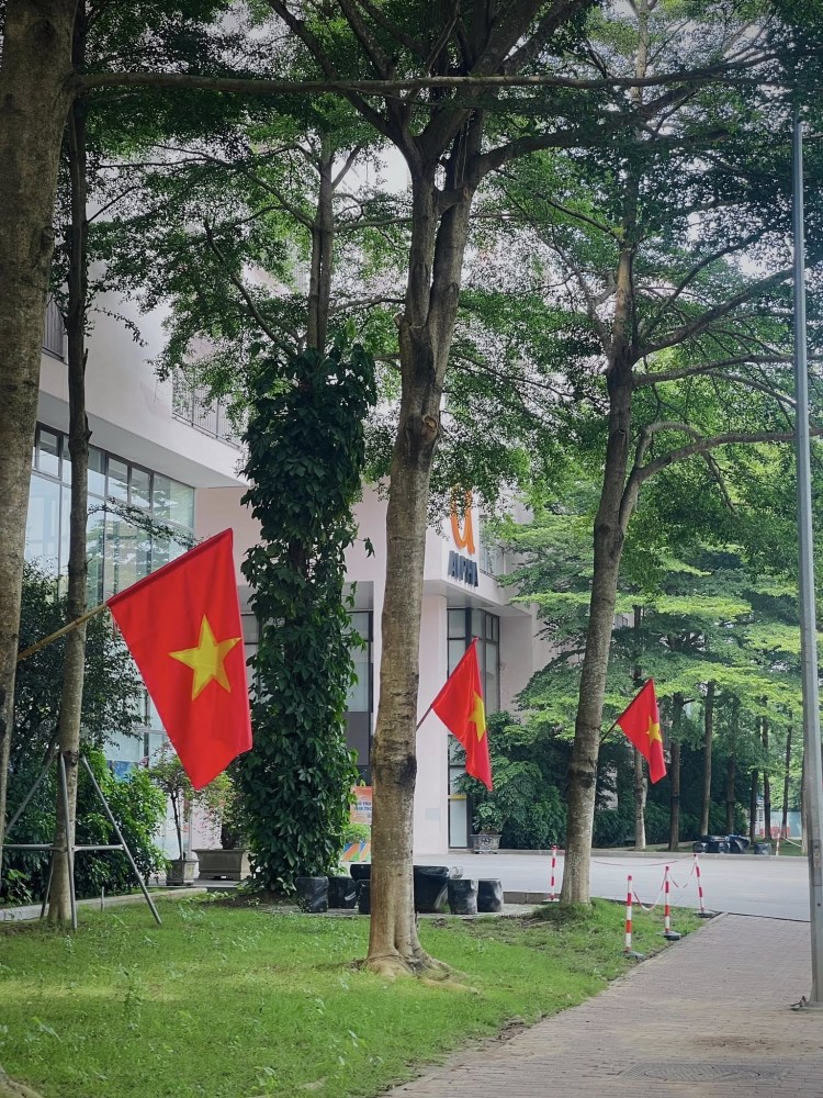 Khuôn viên thân quen của campus FPTU Đà Nẵng nay đều được trang hoàng rực rỡ với sắc cờ hoa. Không khí ngày Quốc khánh lan tỏa, kết nối mọi người trong niềm vui chung của cả đất nước.