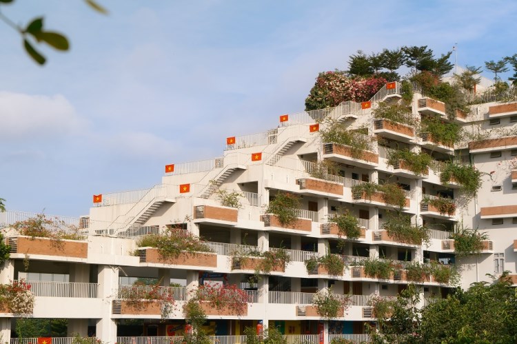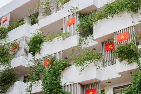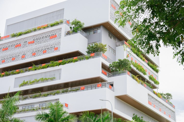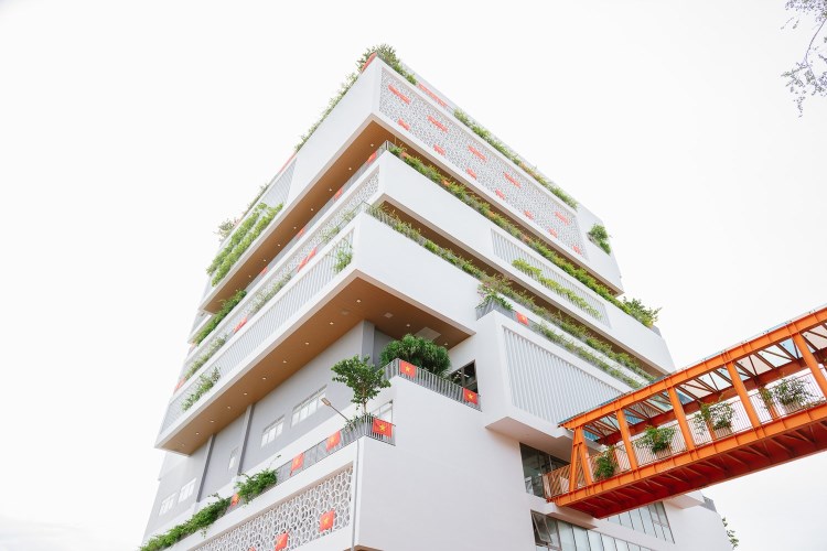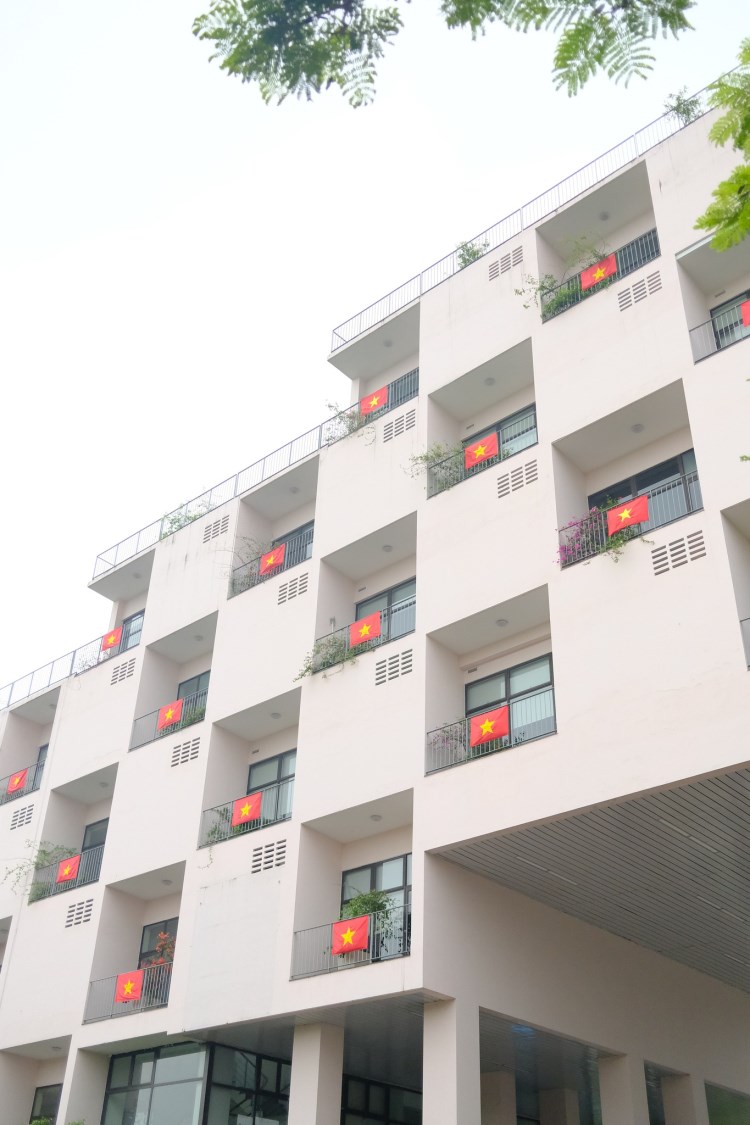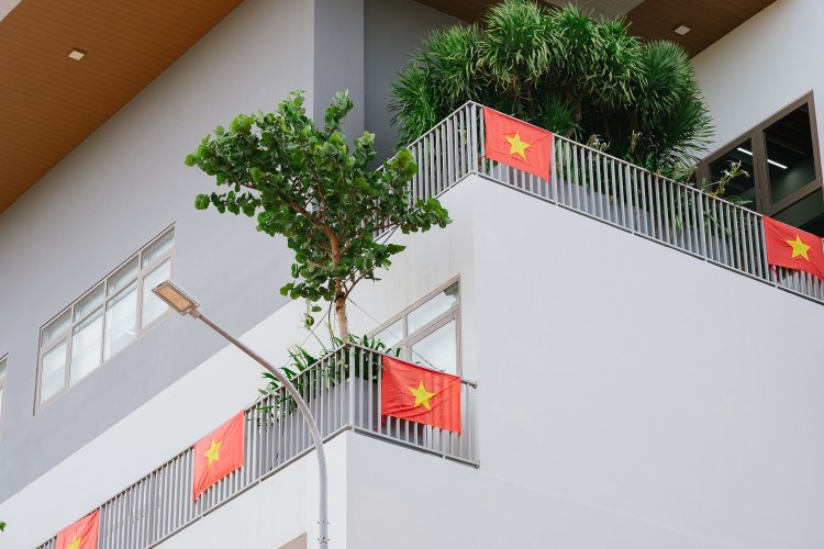 Tòa nhà Alpha khoác lên sắc đỏ - vàng đặc trưng của lá cờ Tổ quốc, campus trở thành nơi lan tỏa tinh thần tự hào dân tộc đến từng góc nhỏ.