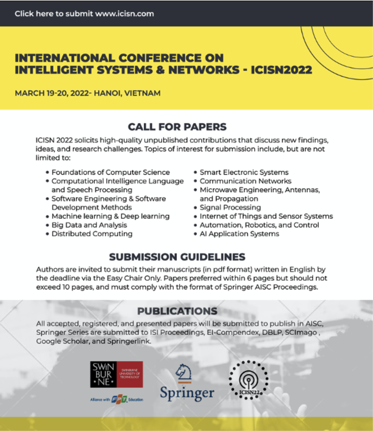 Hội nghị quốc tế về Mạng và Hệ thống thông minh (The International Conference on Intelligent Systems & Networks – ICISN) là hội thảo khoa học quốc tế về công nghệ và chuyển đổi số được định hướng tổ chức thường niên và xuất bản kỷ yếu trên nền tảng của các tổ chức học thuật uy tín trên thế giới như: Springer, SCImago, ISI và Google Scholar. Đây là diễn đàn quốc tế nhằm trao đổi học thuật giữa các nhà khoa học Việt Nam với các nhà khoa học đến từ nhiều nước trên thế giới trong lĩnh vực điện tử, truyền thông, công nghệ thông tin cùng các lĩnh vực khác có liên quan. |